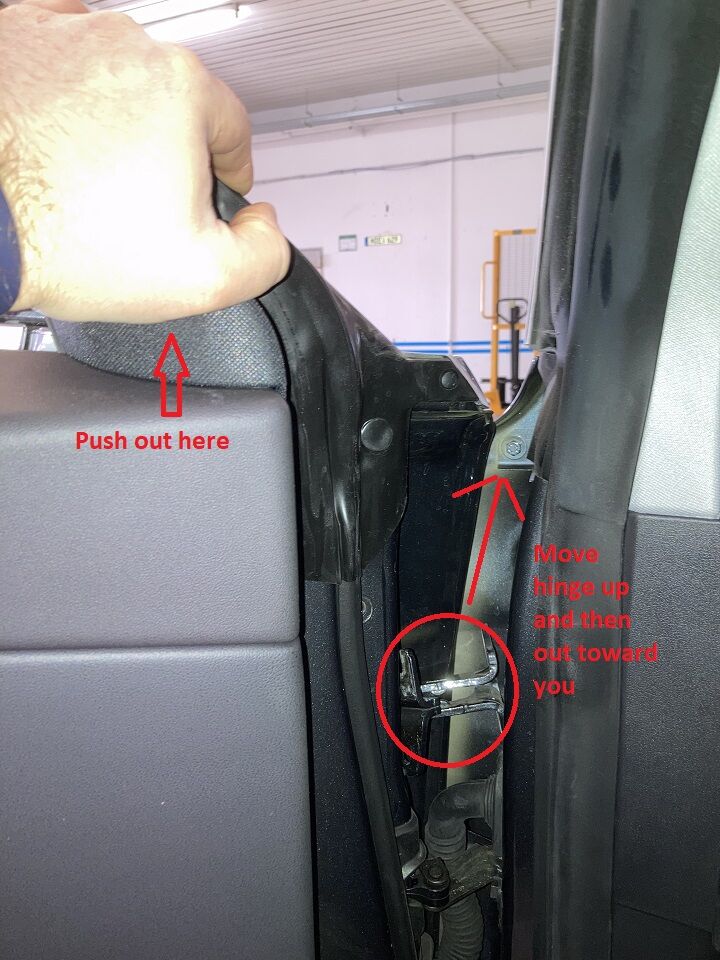 用一只手在车门顶部靠近扬声器的位置向外推,然后将 LH 前车门上部铰链先向上再向外送入车辆后部,以将其拆下。