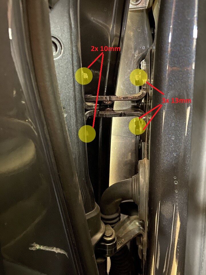 使用 IPA 湿巾清洁 LH 前车门上部铰链螺栓头,风干 1 分钟,然后再继续执行下一步。