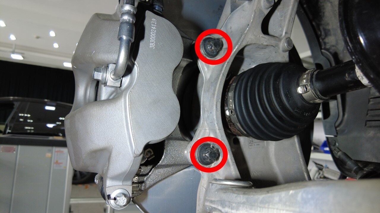 拆卸并弃置将左前制动钳固定到左前转向节的螺栓(2 个),拆下制动钳,然后用 S 型挂钩将该制动钳挂到一旁。