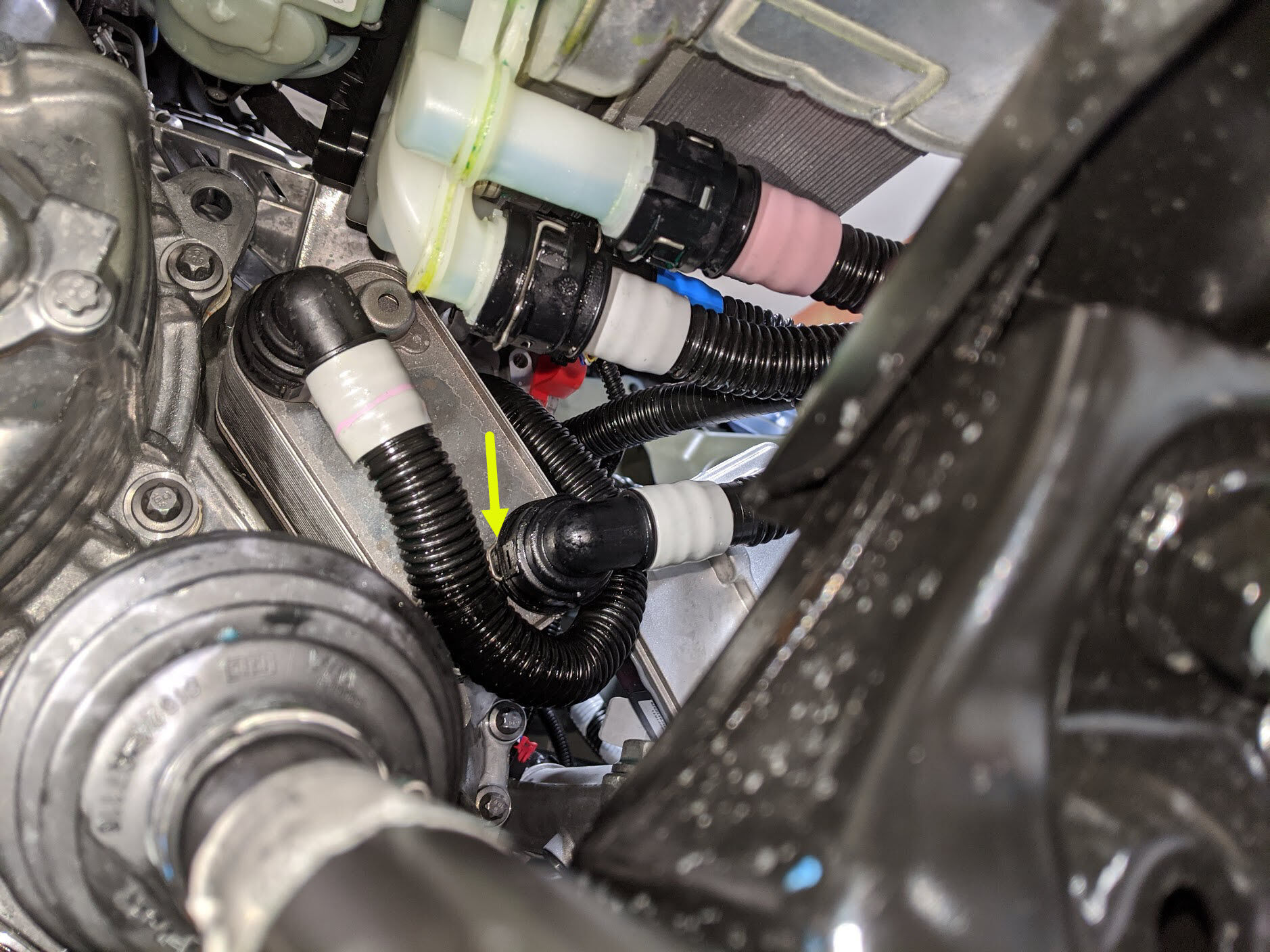 Model 3 - 松开将前驱动单元变流器进口软管固定到车身的卡子。