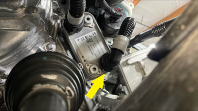 松开卡子,断开前驱动单元变流器进口软管与动力总成回流软管的连接,然后立即堵住两个接头。