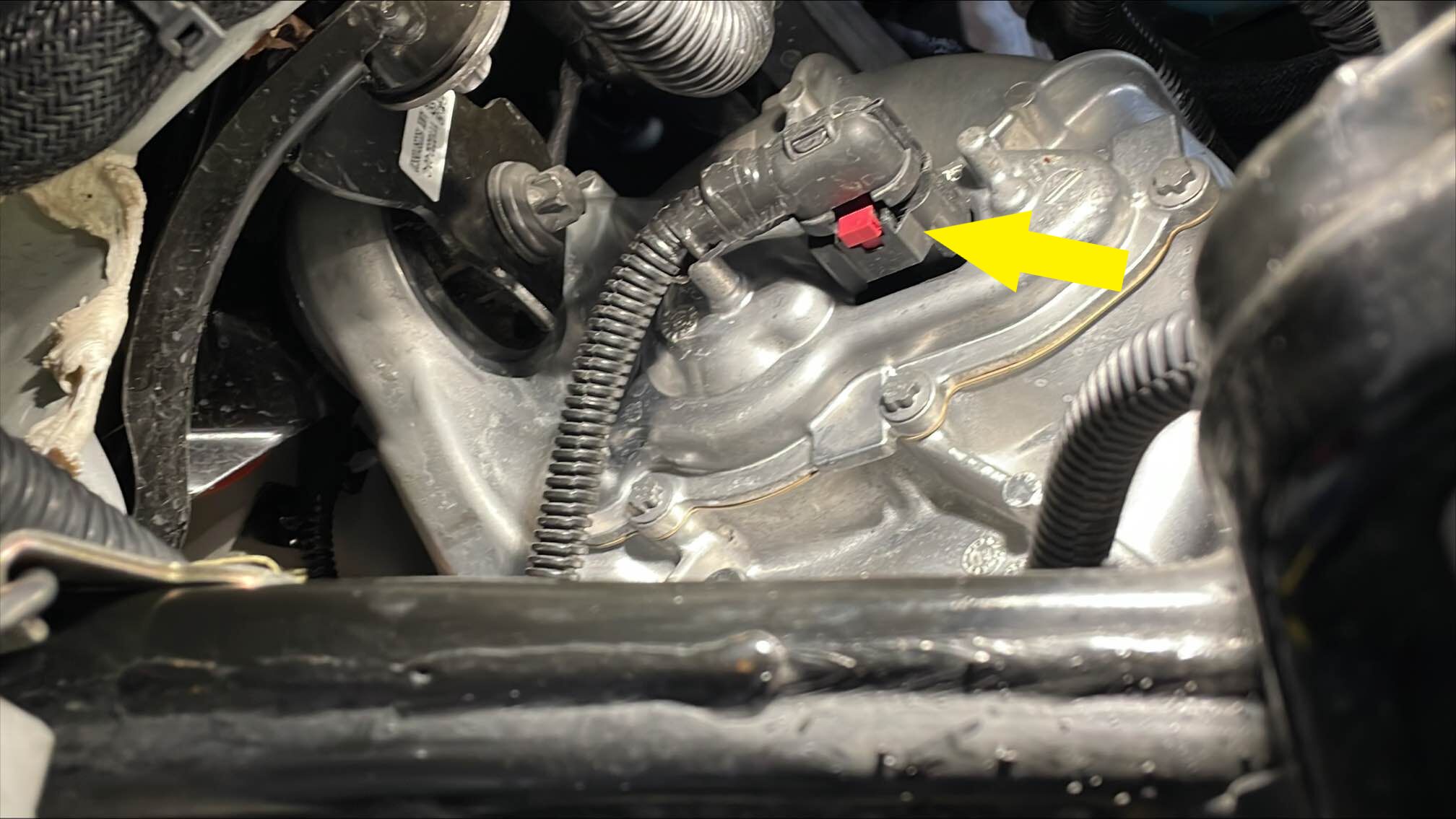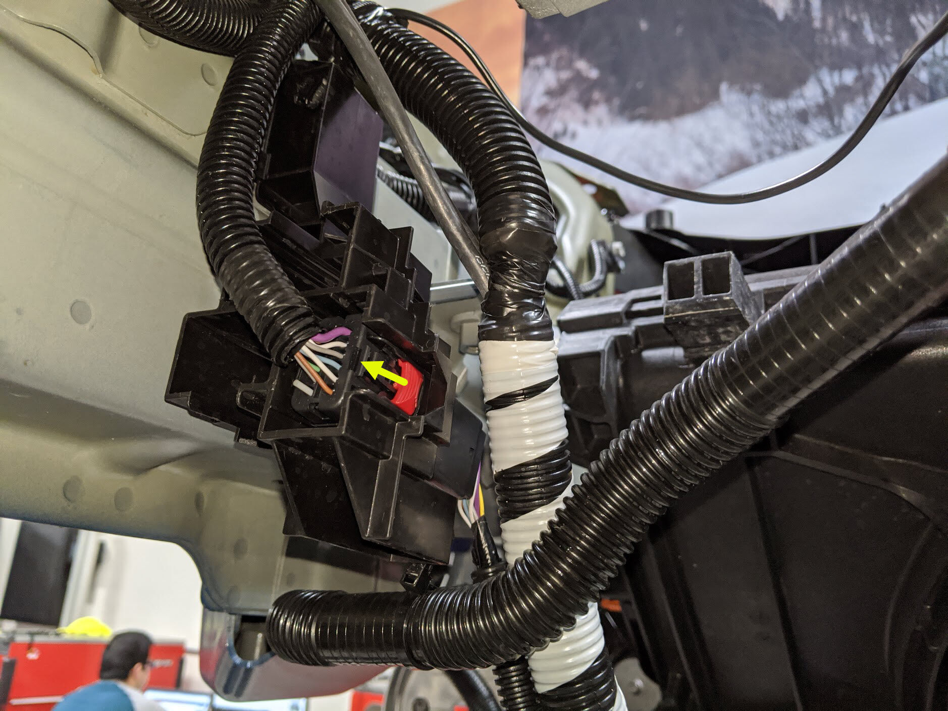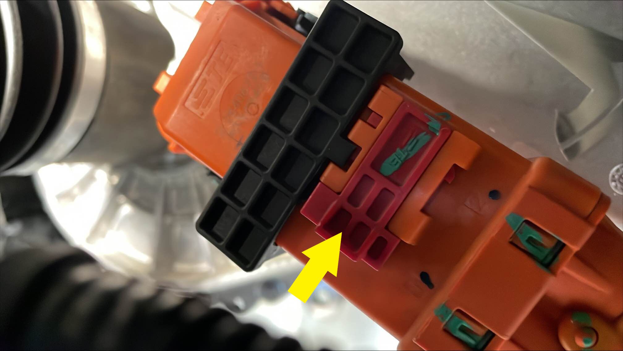 将副车架电气线束连接到前驱动单元电机解析器连接器,然后按下红色锁片以固定连接器。