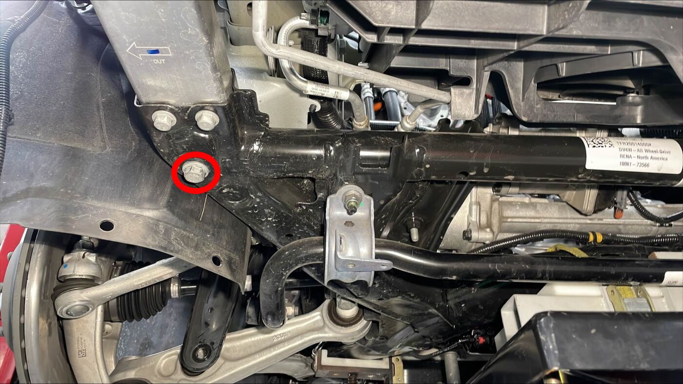 拆下并弃用将前副框架后部固定到车身的大号螺栓 (x2)。