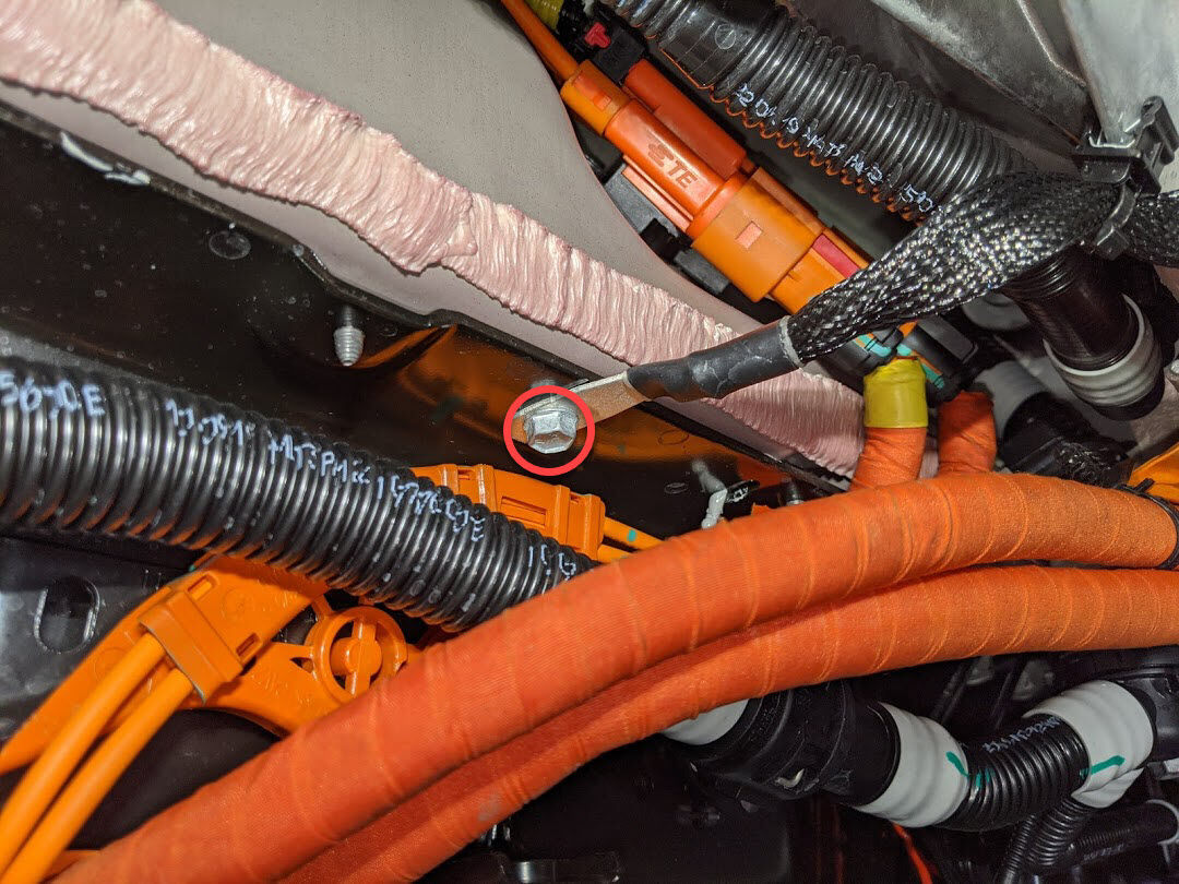 紧固将前驱动单元接地带固定到高压电池的螺栓。