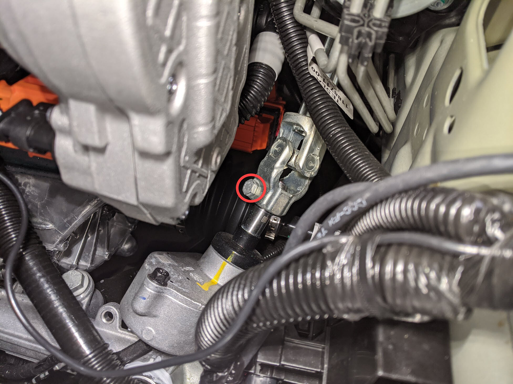 将中间轴向下滑动到转向机上,然后安装将中间轴固定到转向机的螺栓。