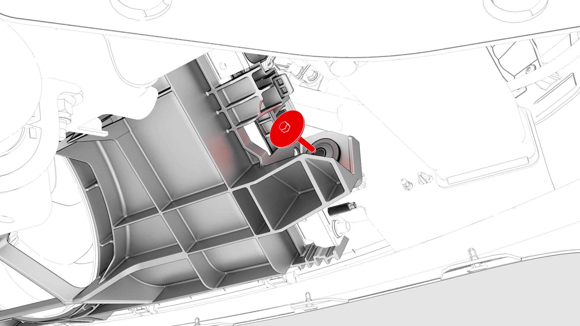 拆卸将前备箱储物单元加固支架固定到冷却风扇的螺栓,然后将加固支架滑至一旁以留出间隙。