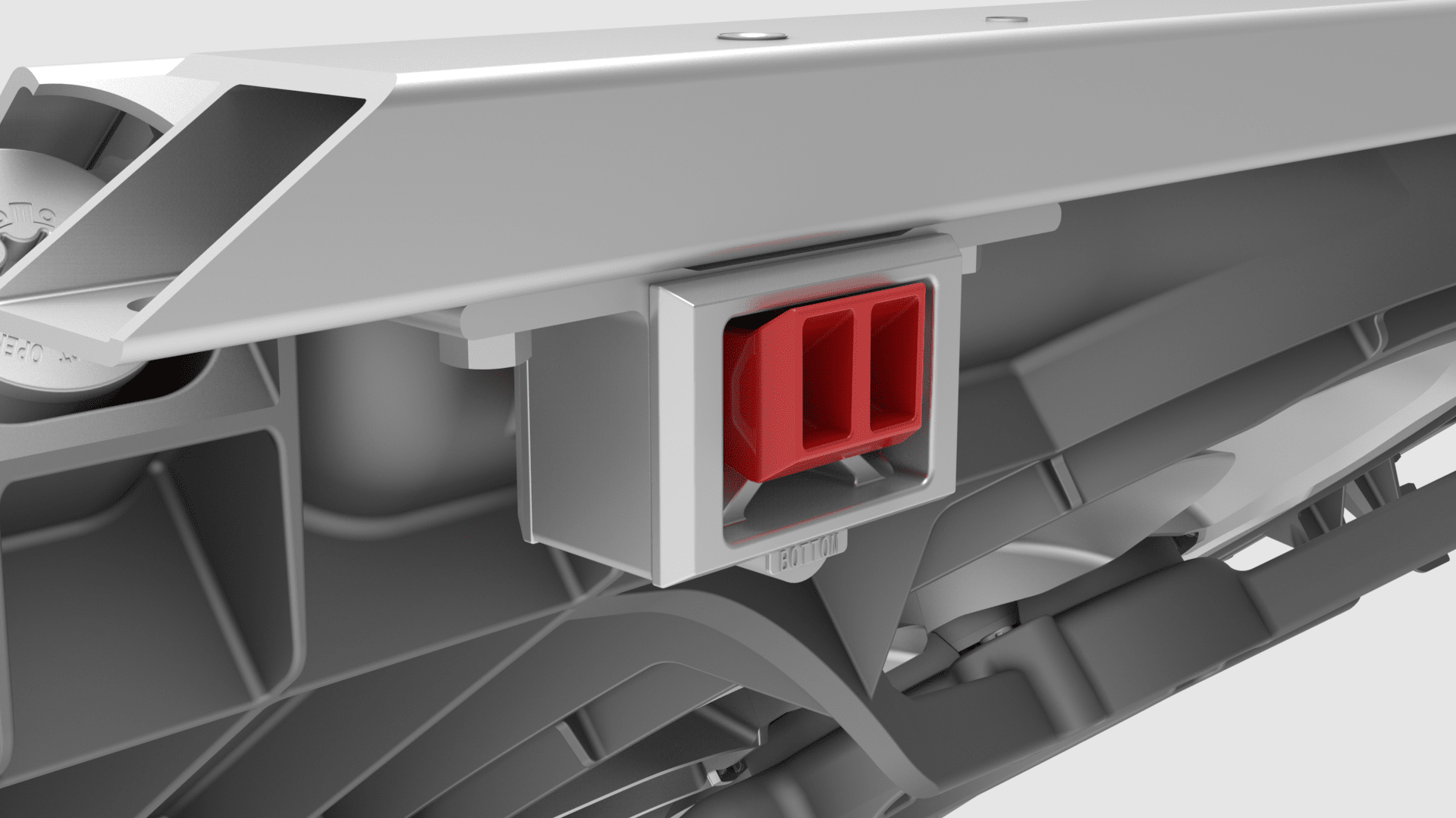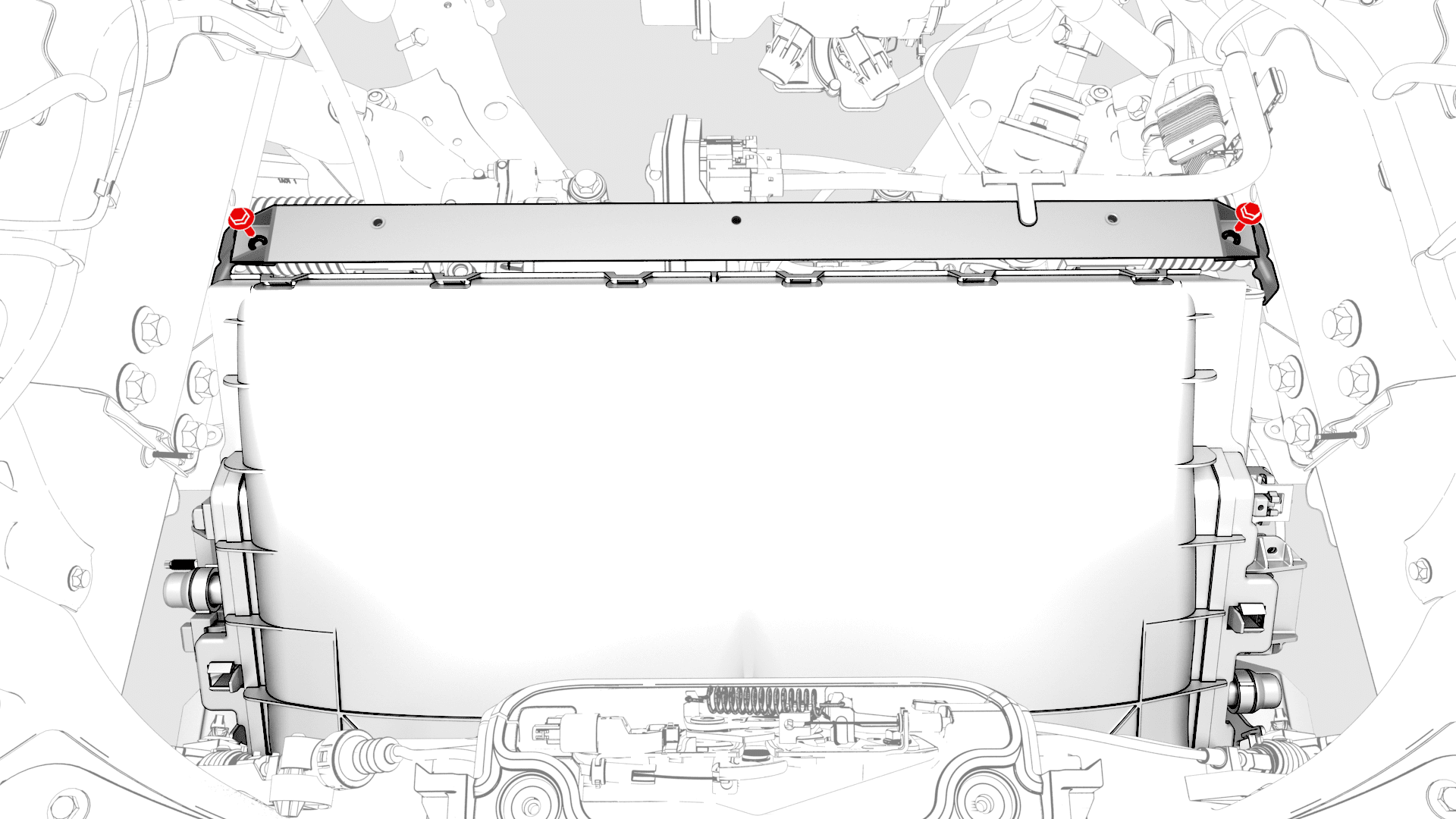 将前备箱加固支架滑到冷却风扇模块顶部。