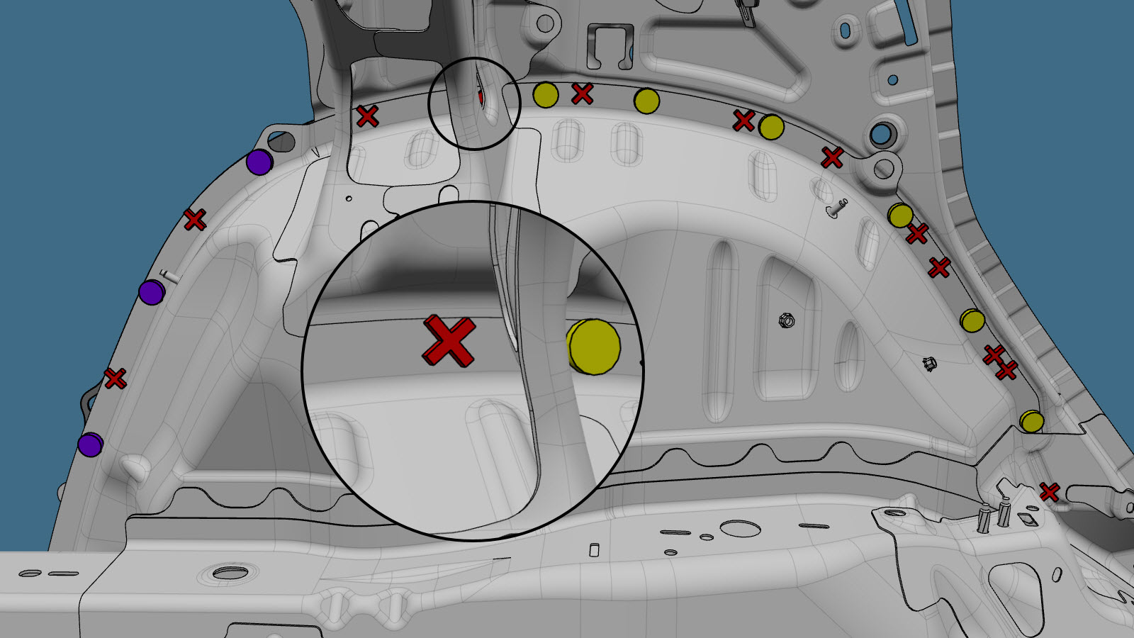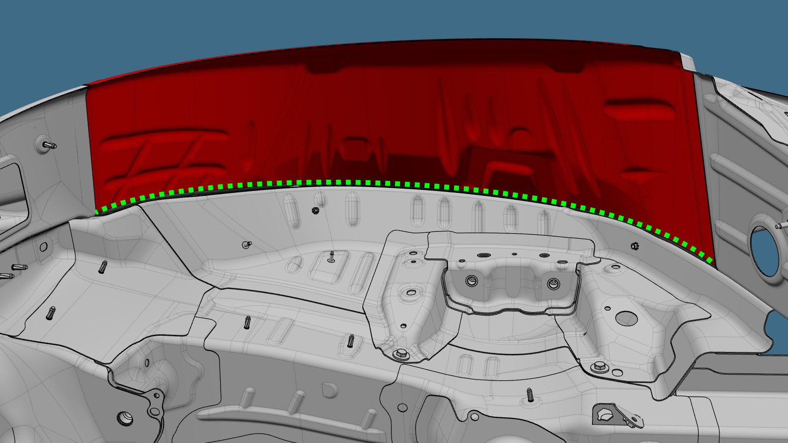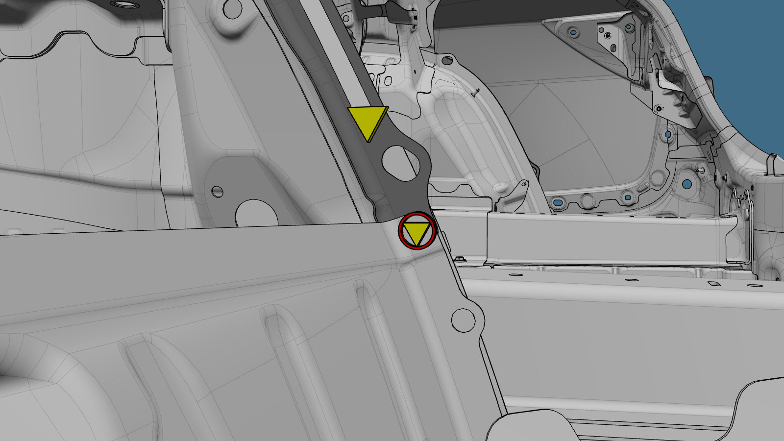 | 黄色区域: | 允许在这些区域进行分割。 注 在这些区域进行分割时,为确保组件能够正常使用,必须将其恢复为原始几何形状。 搭接接头的搭接量不得小于 25 毫米,并用结构型粘合剂固定。 注 在红色区域和黄色区域之间使用搭接接头时,红色区域与黄区域的搭接量不得小于 25 毫米。不得从黄色区域搭接到红色区域。。 以黄色显示的区域可能会进水,因此要特别小心,确保密封件正确装配在所有维修区域。 注 维修完成后,确保所有密封件正确装配,并确保维修区域没有进水。 其他组件可安装至这些区域的后轮拱。请务必确保维修区域的开口与原来的开口大小相同,且组件能够在安装区域中正确安装。 注 维修完成后,确保安装的组件与车身侧外件表面齐平,并且组件正确装配在所有维修区域内。 |