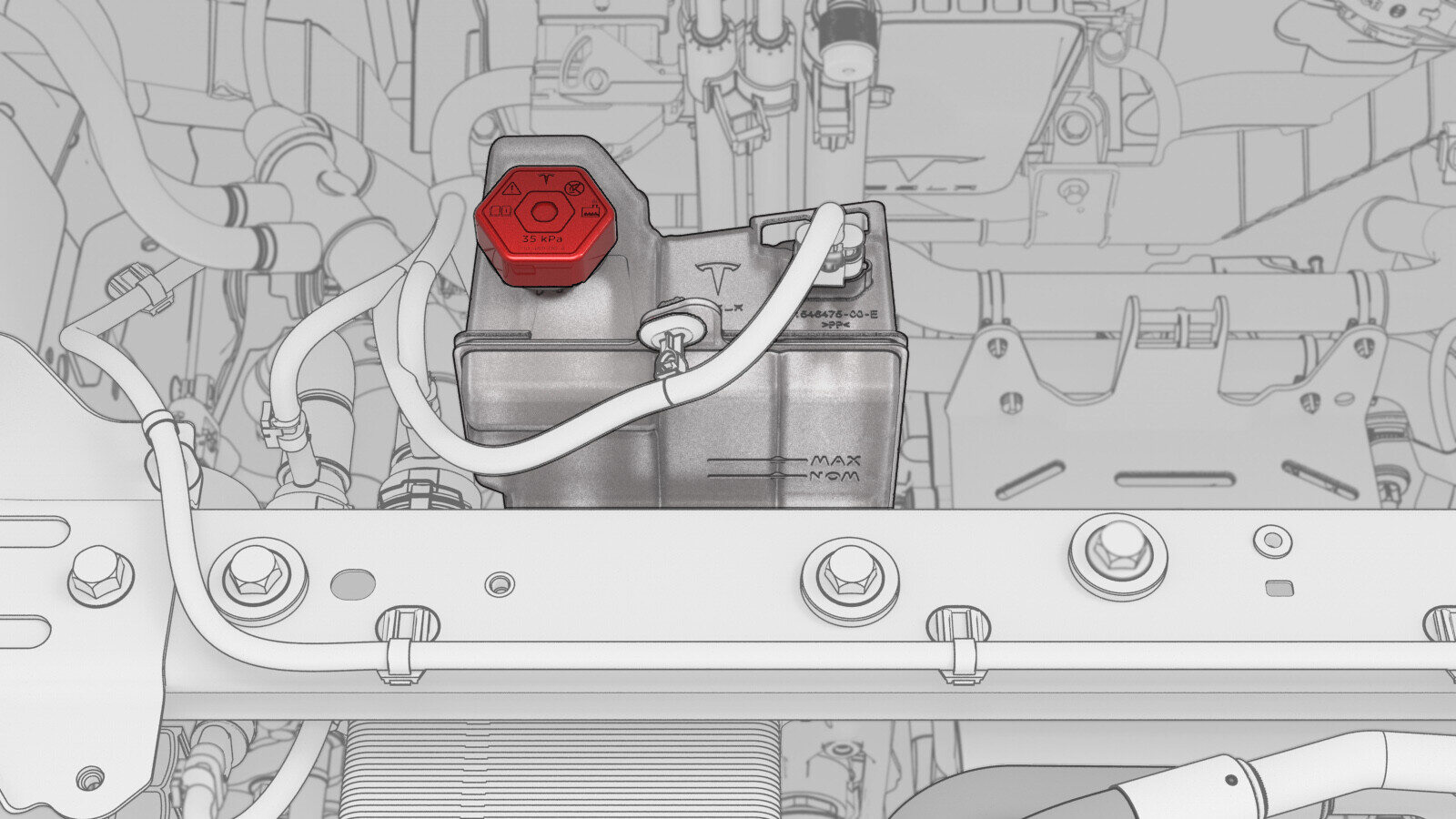 图 1. 预热泵款 Model 3 上的超级瓶盖 图 2. 加热泵款车辆上的冷却液罐盖 - 将冷却液储液罐加注至“MAX”刻度线处。