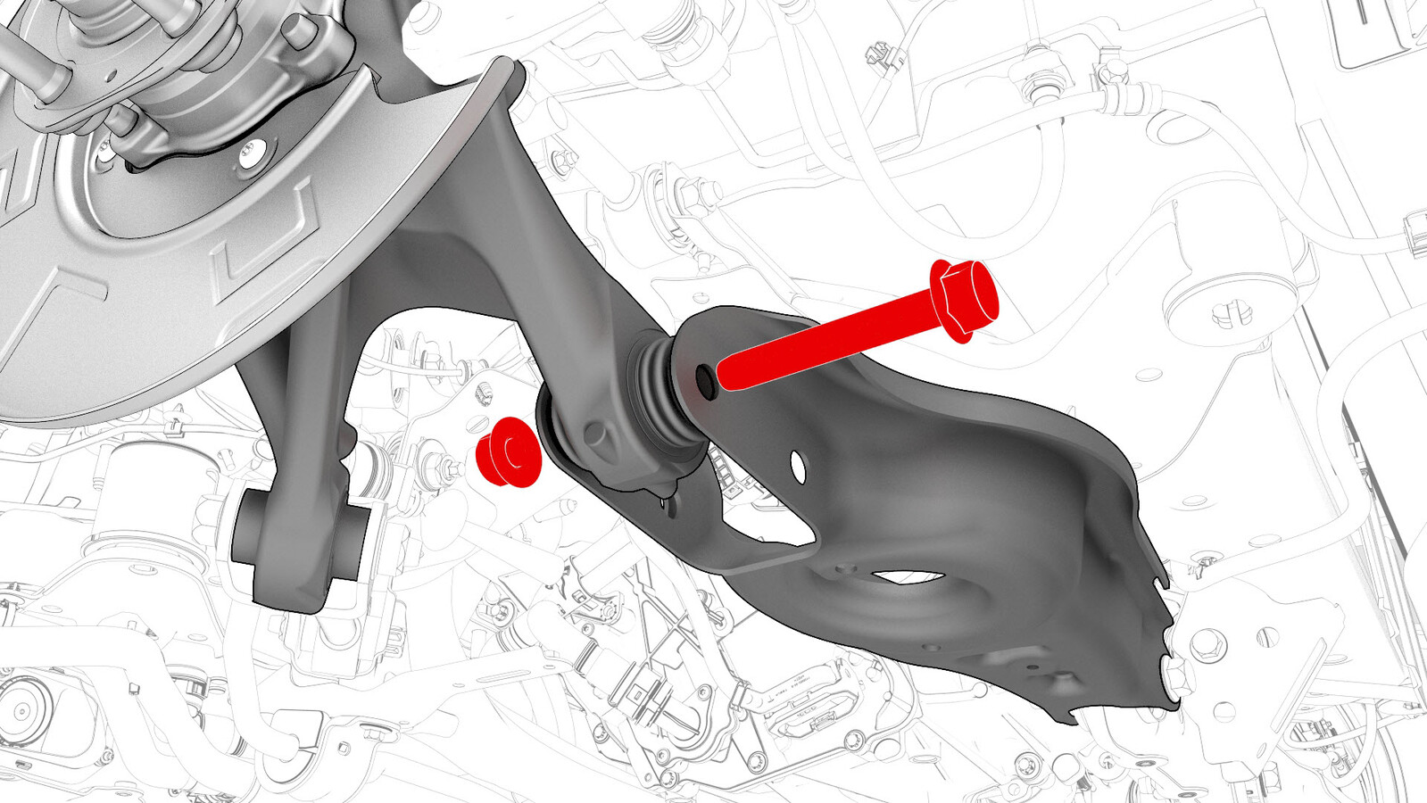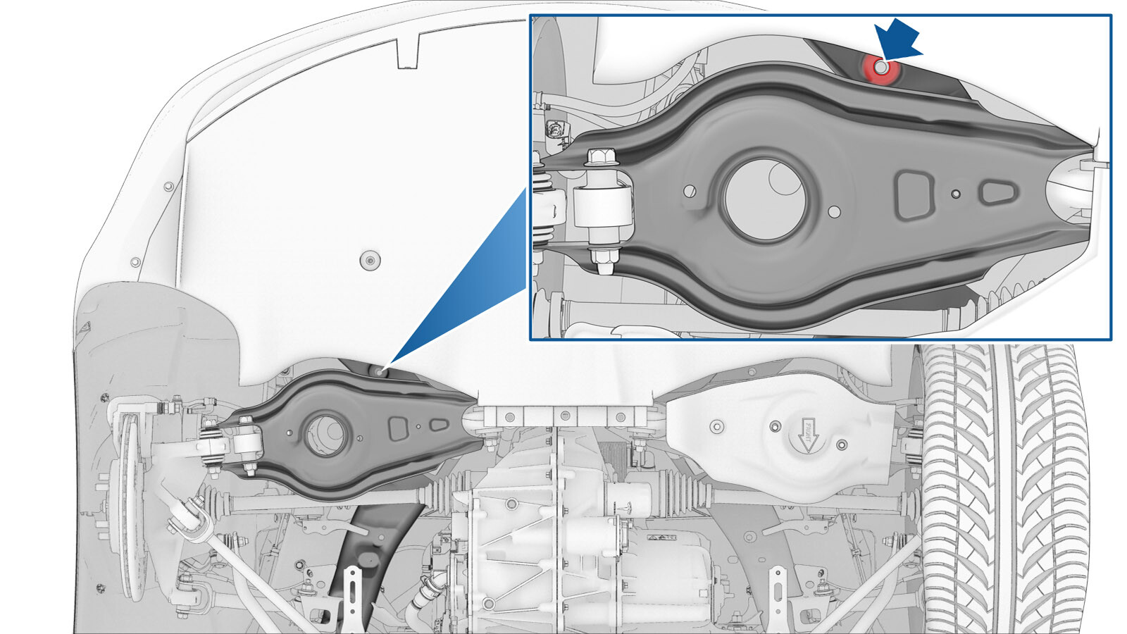 - 松开将 LH 后下方控制臂固定到副框架的螺母。