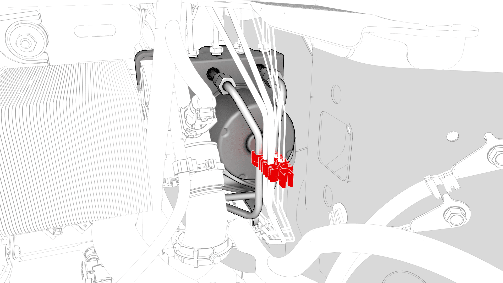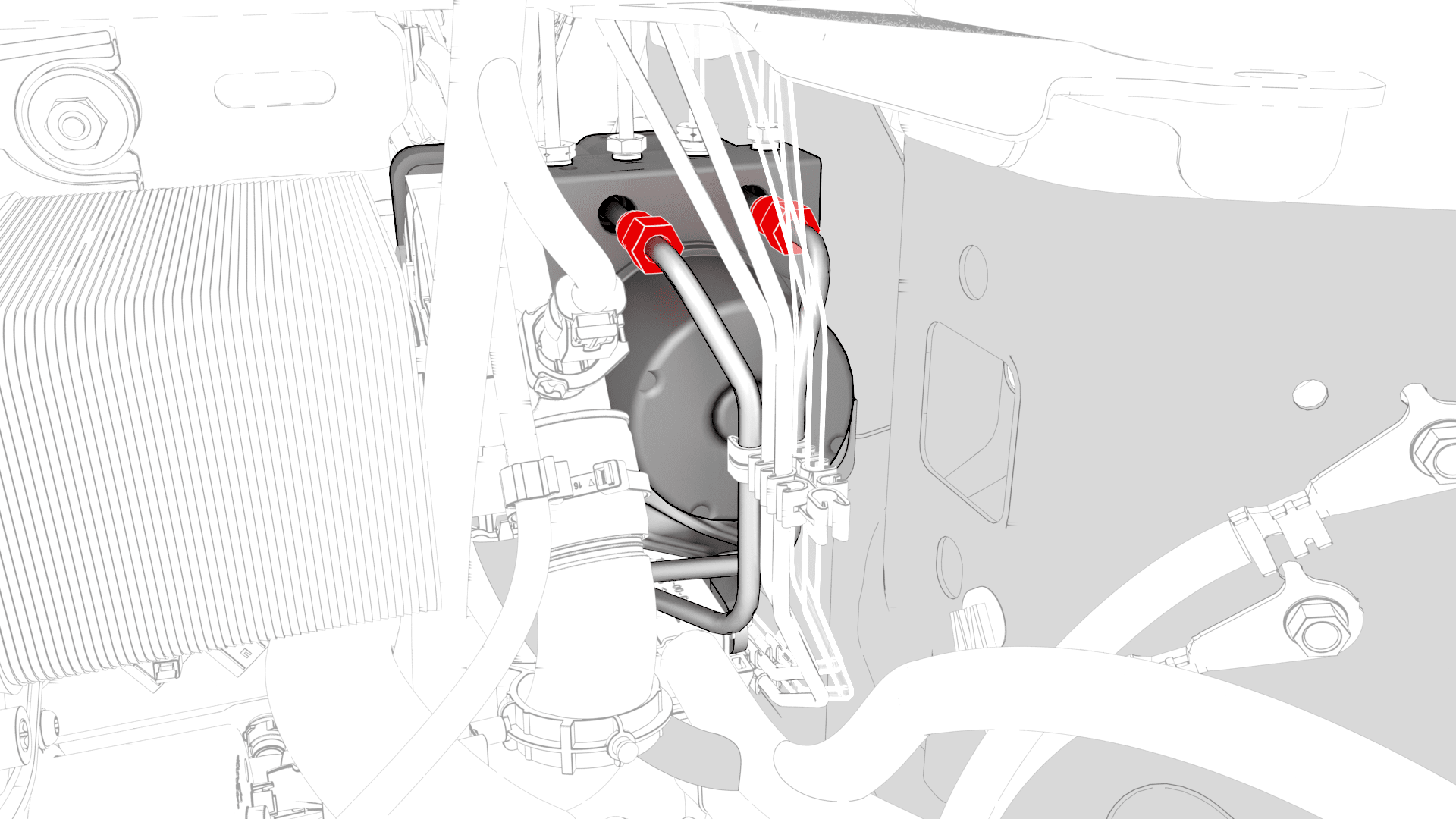 - 将制动管路放到防抱死制动系统单元和主缸适当位置。