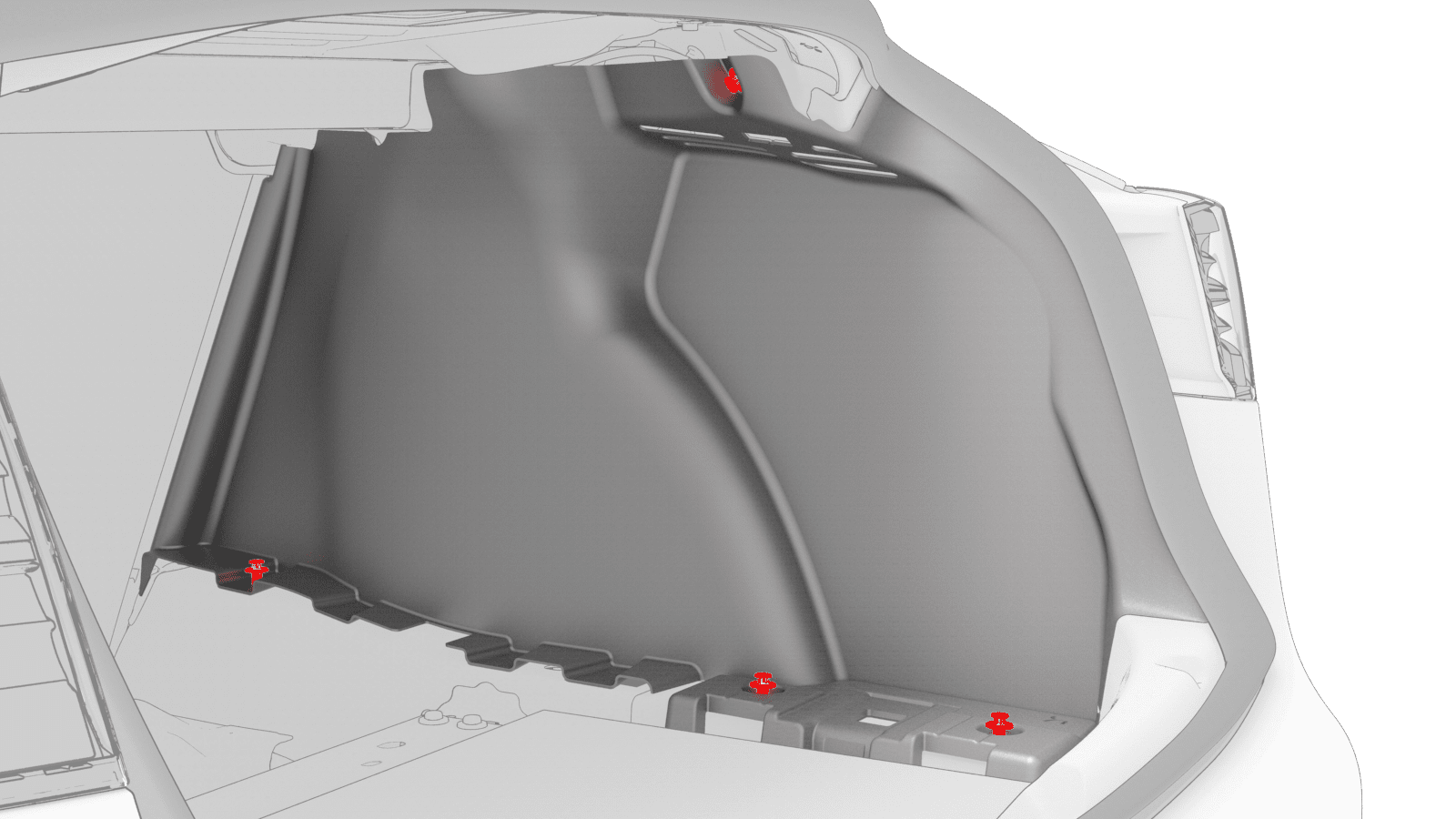 拆下将行李箱 RH 侧饰板固定到车身的卡扣,然后从车上拆下侧饰板。