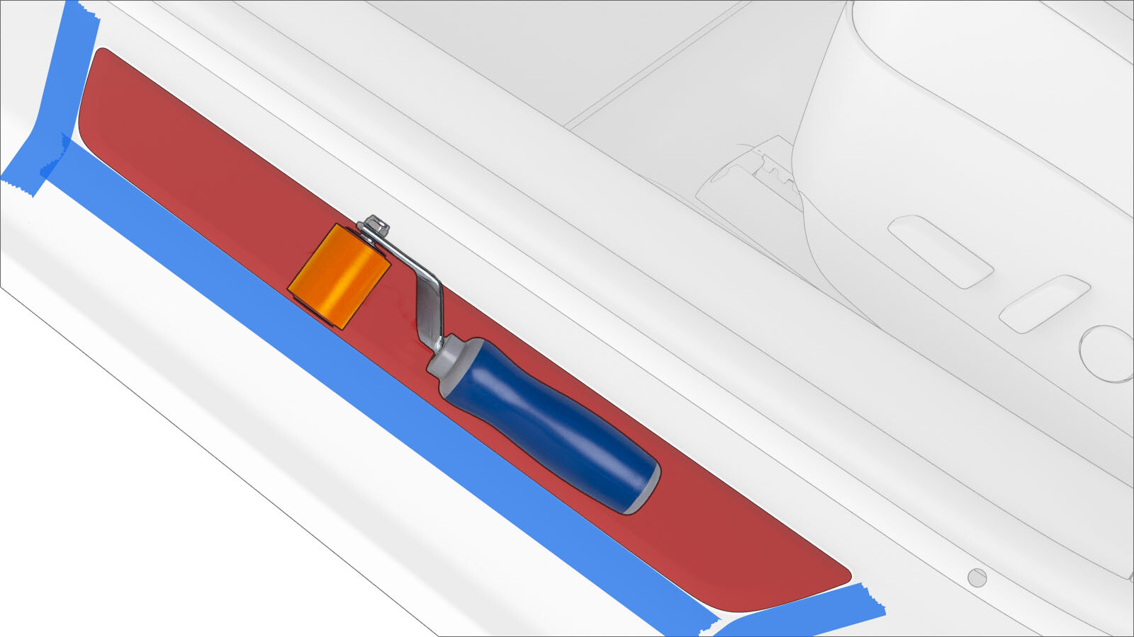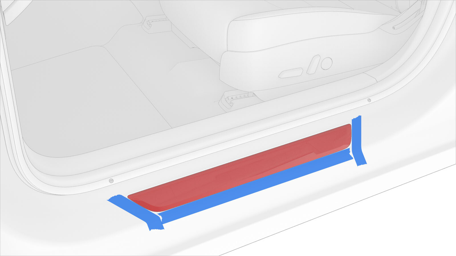- 将遮蔽胶带作为指引,将新门槛板稳妥放置入位,然后下压,使其粘贴在车上。