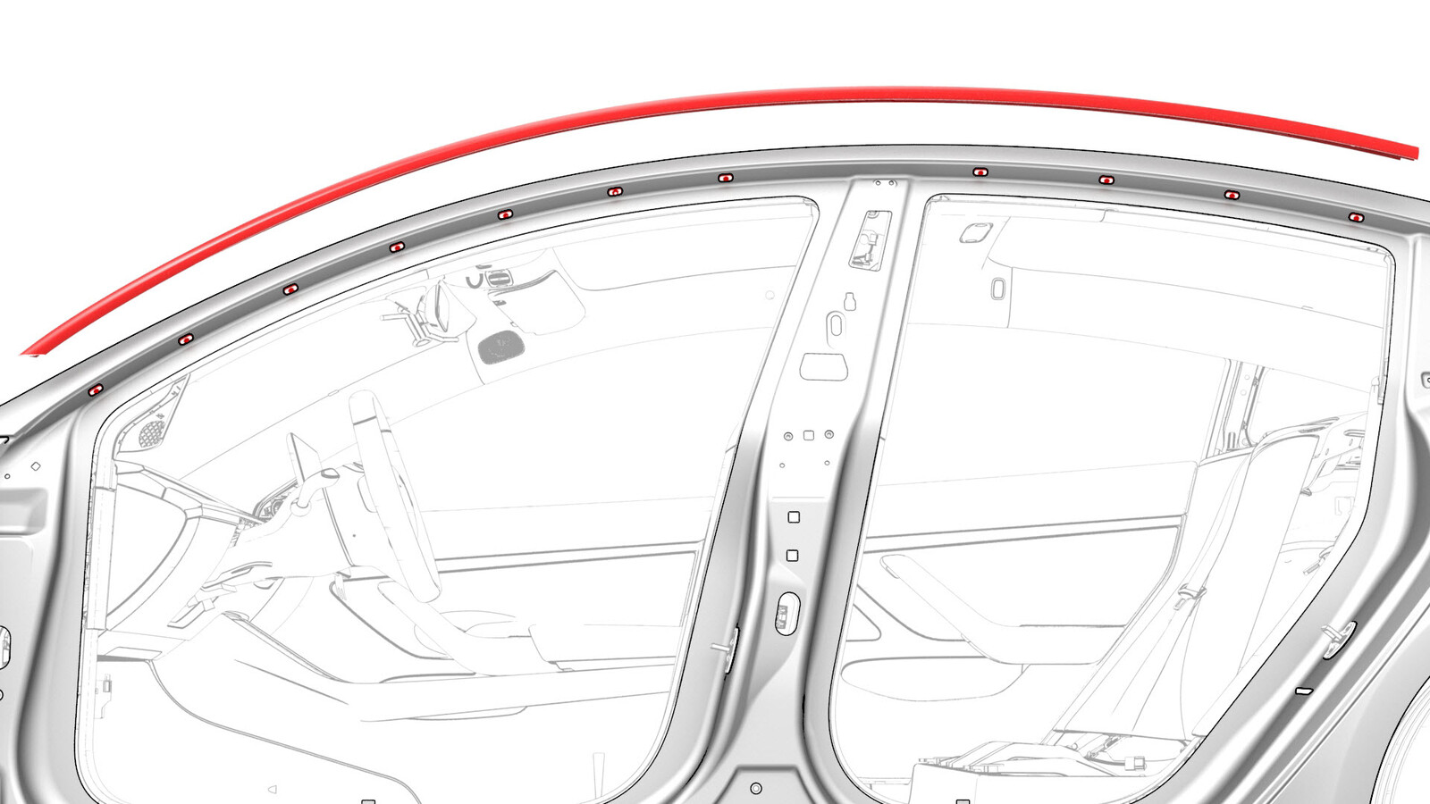 向上压以便将前后主车身密封条紧固到左侧顶部亮条上。
