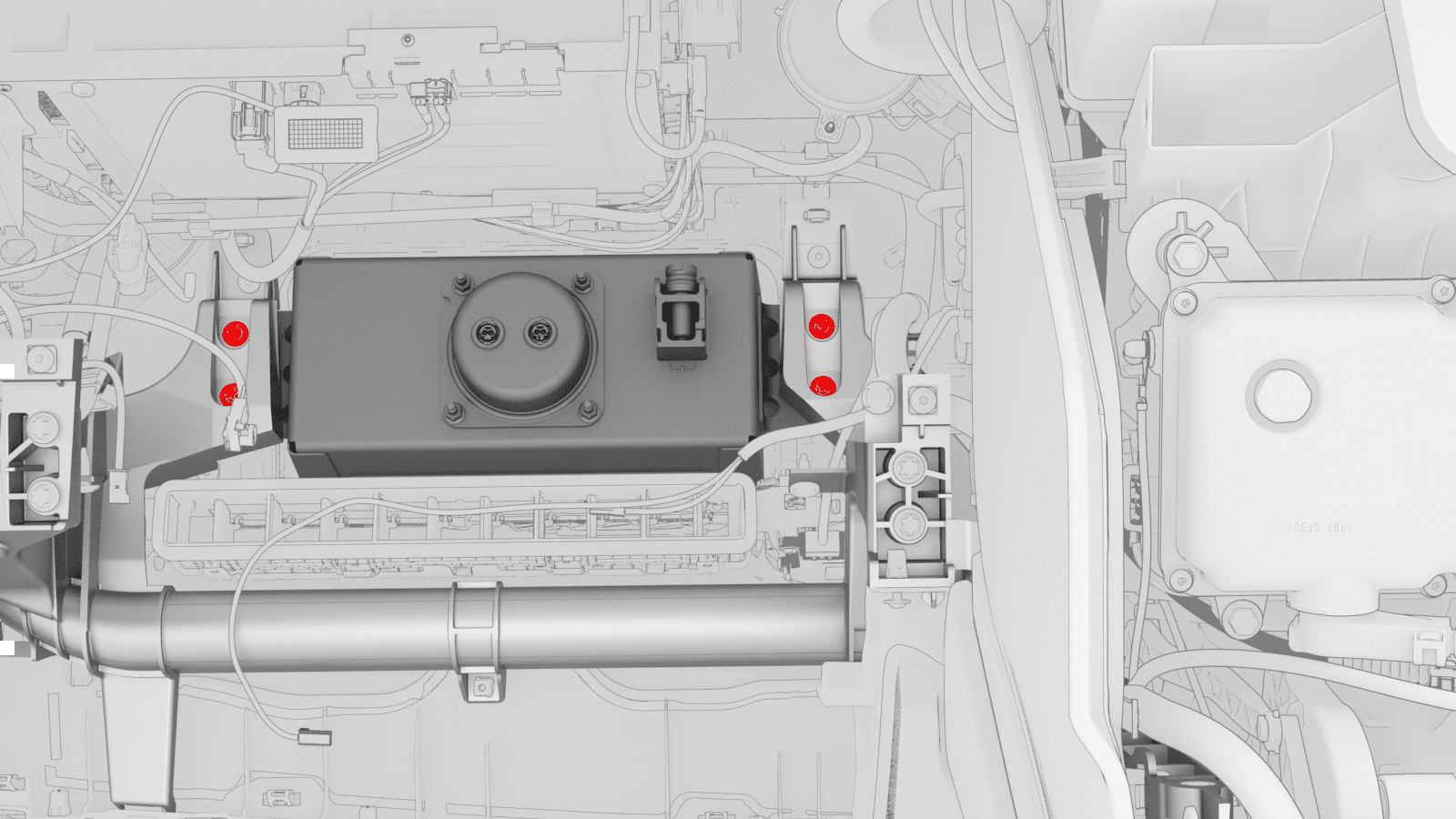 - 拆下副驾位脚部空间风管。请参阅 #GUID-7288BF4E-BE1E-44AF-9CB1-BB2C0050F61A。