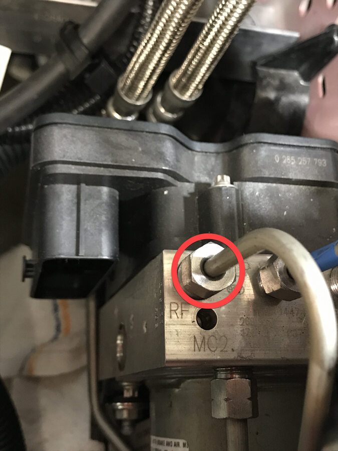 Remove the nut that attaches the RH rear brake line to the hydraulic control unit.