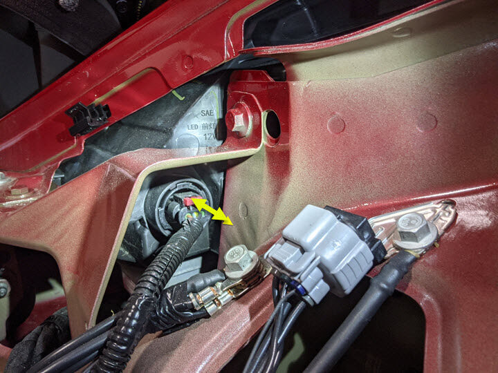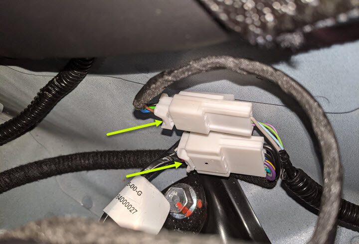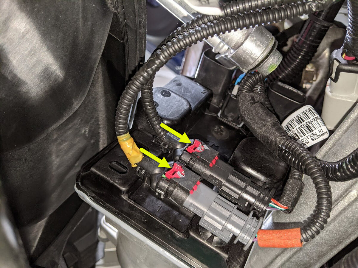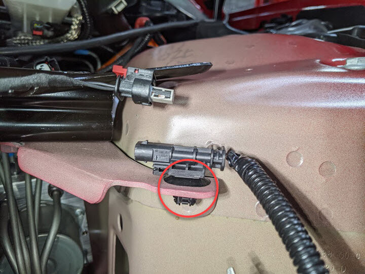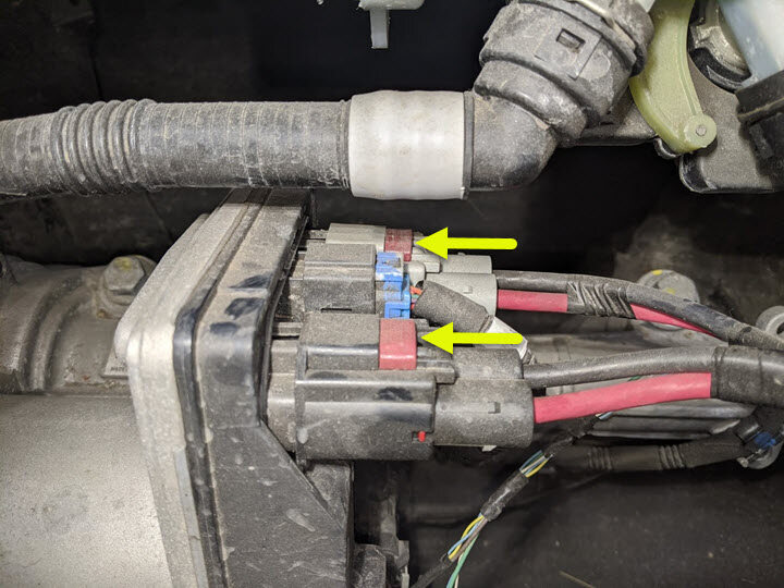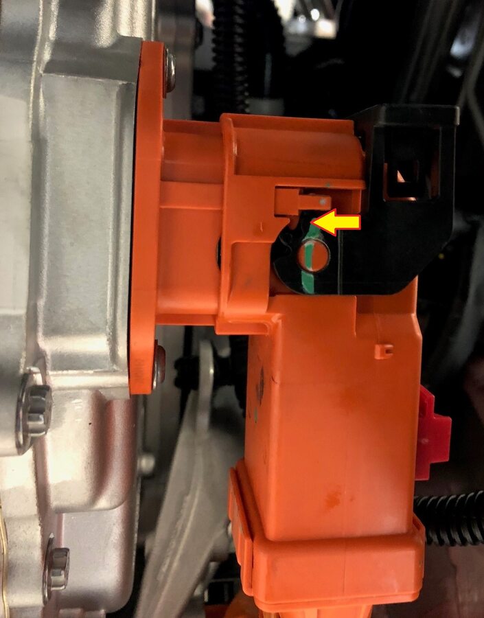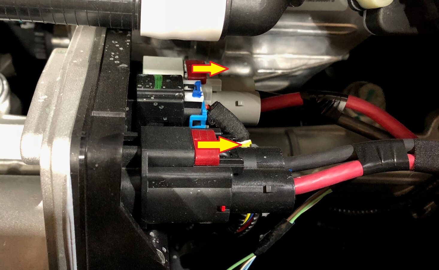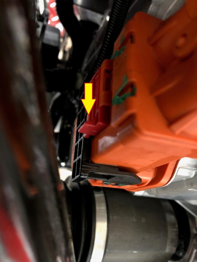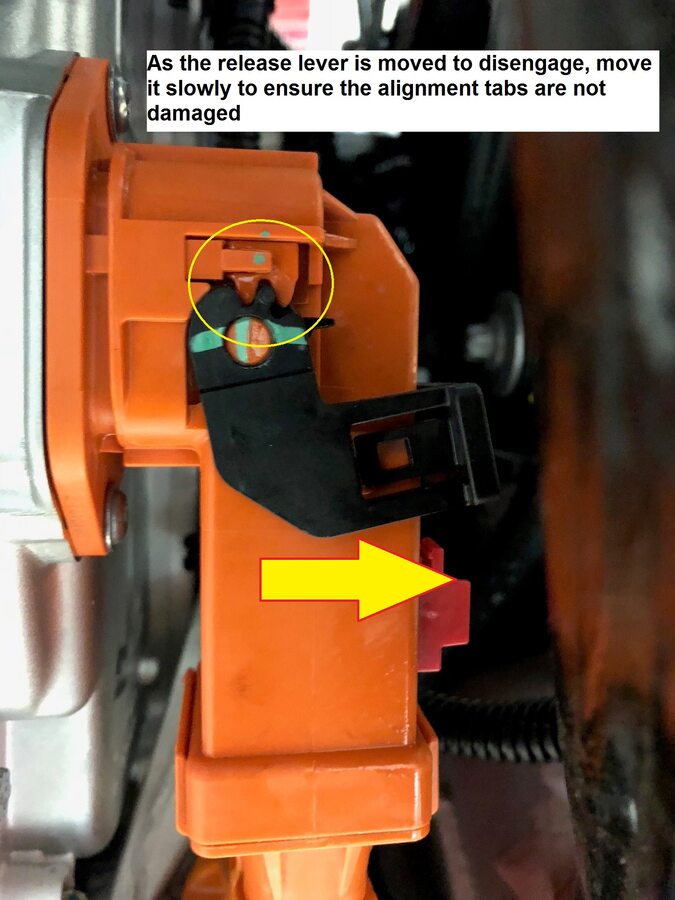 注Two stage connectors. Move the red locking tab to the left, then depress the connector release to disconnect the connector.