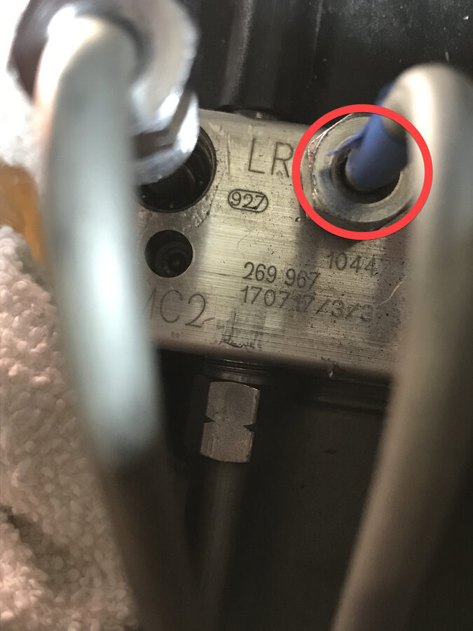 Remove the nut that attaches the master cylinder primary brake line to the hydraulic control unit.