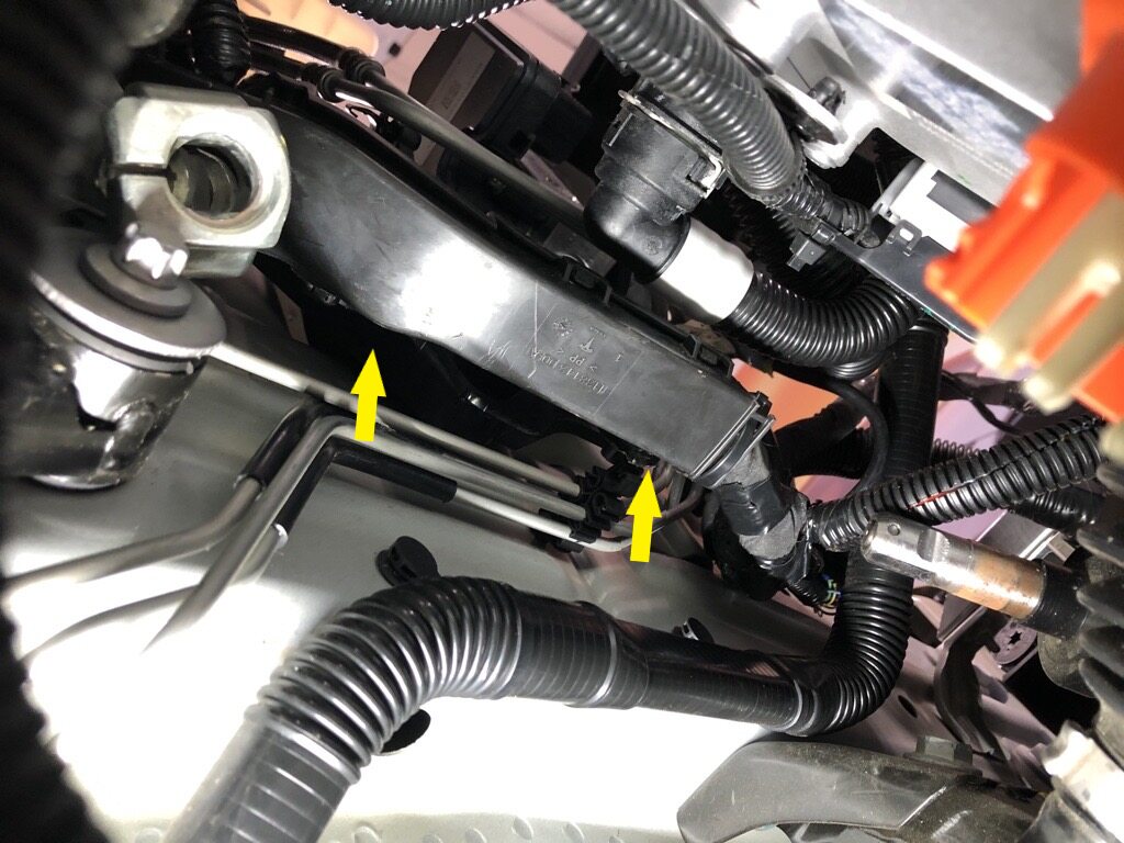 Release the clips (x2) that attach the front harness and coolant hose to the brackets.