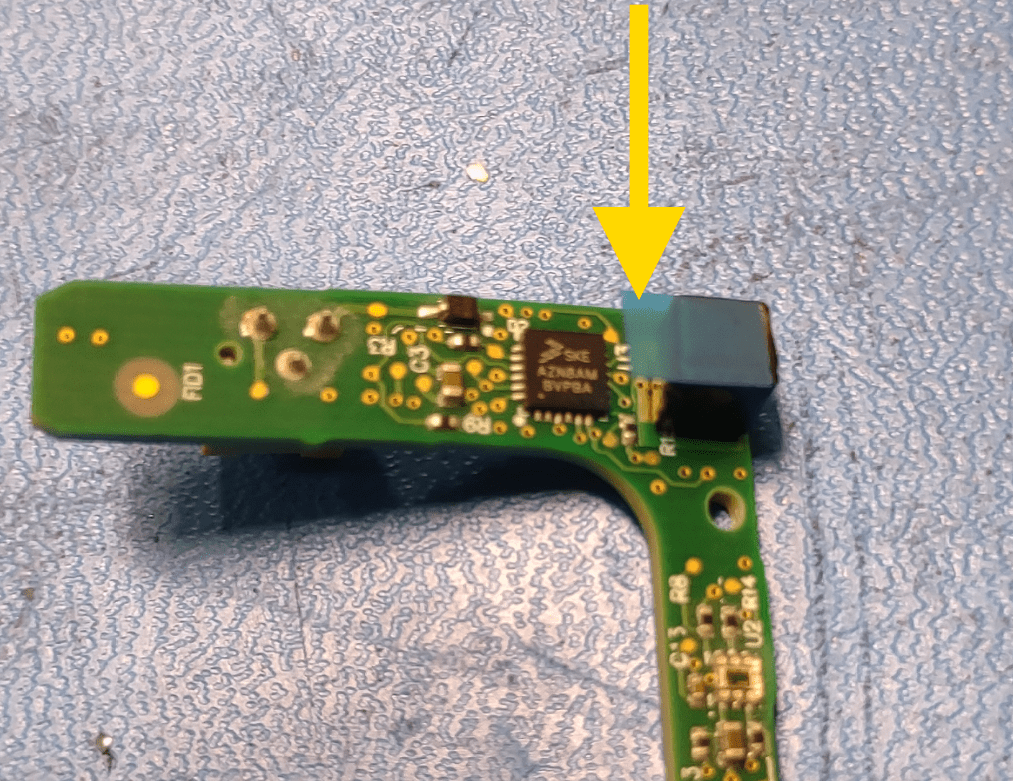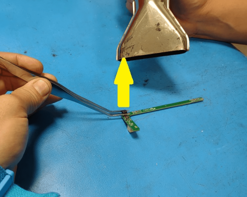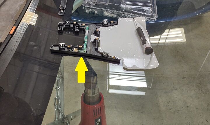 如图所示,使用热风枪在挡风玻璃外侧对粘合剂加热,然后在加热时轻轻地将板撬离支架,将传感器从支架上拆下。