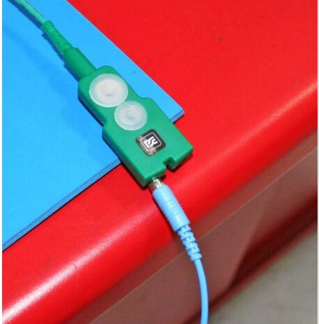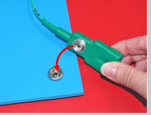 将接地线上的按钮连接器卡到静电放电 (ESD) 垫的按钮连接器上。