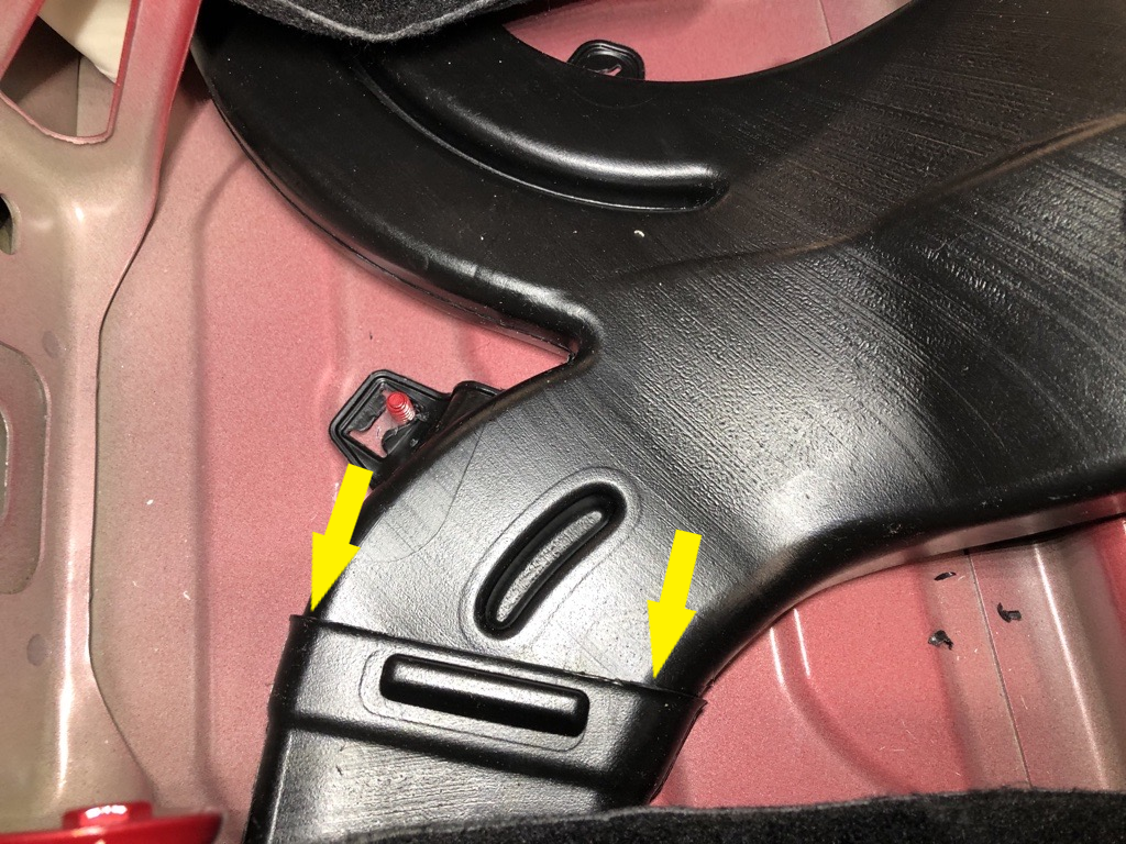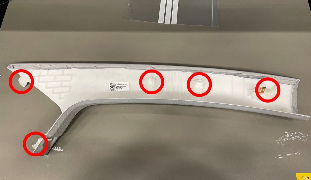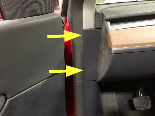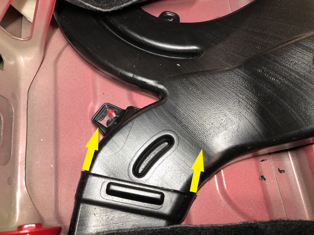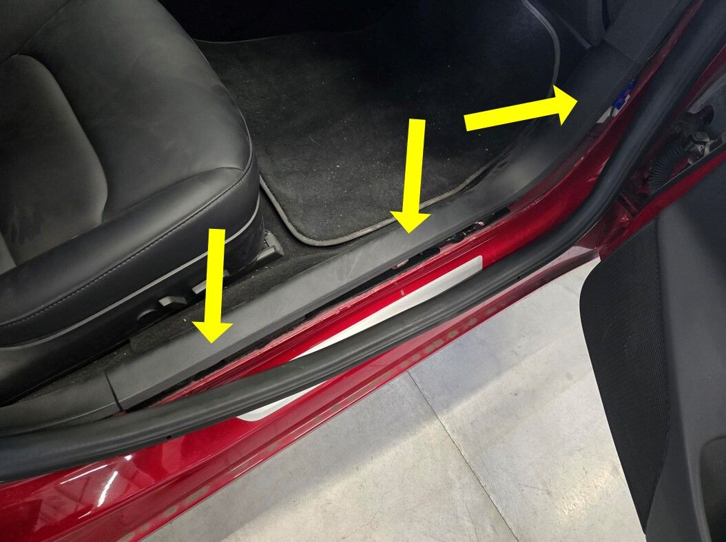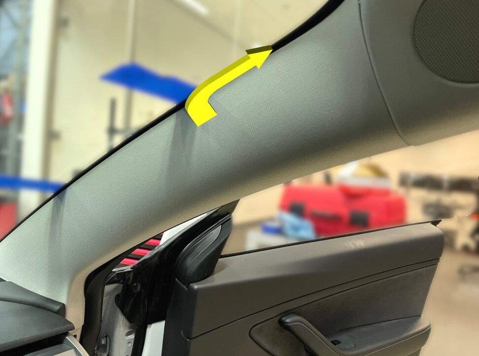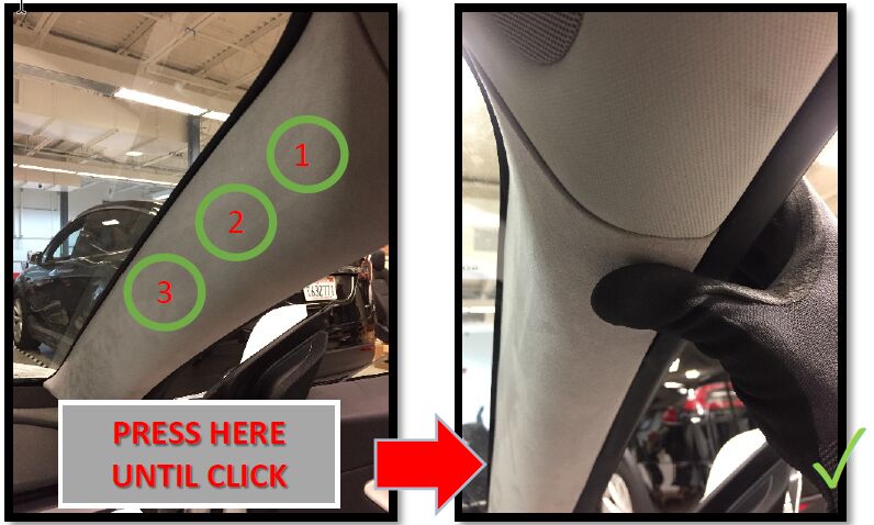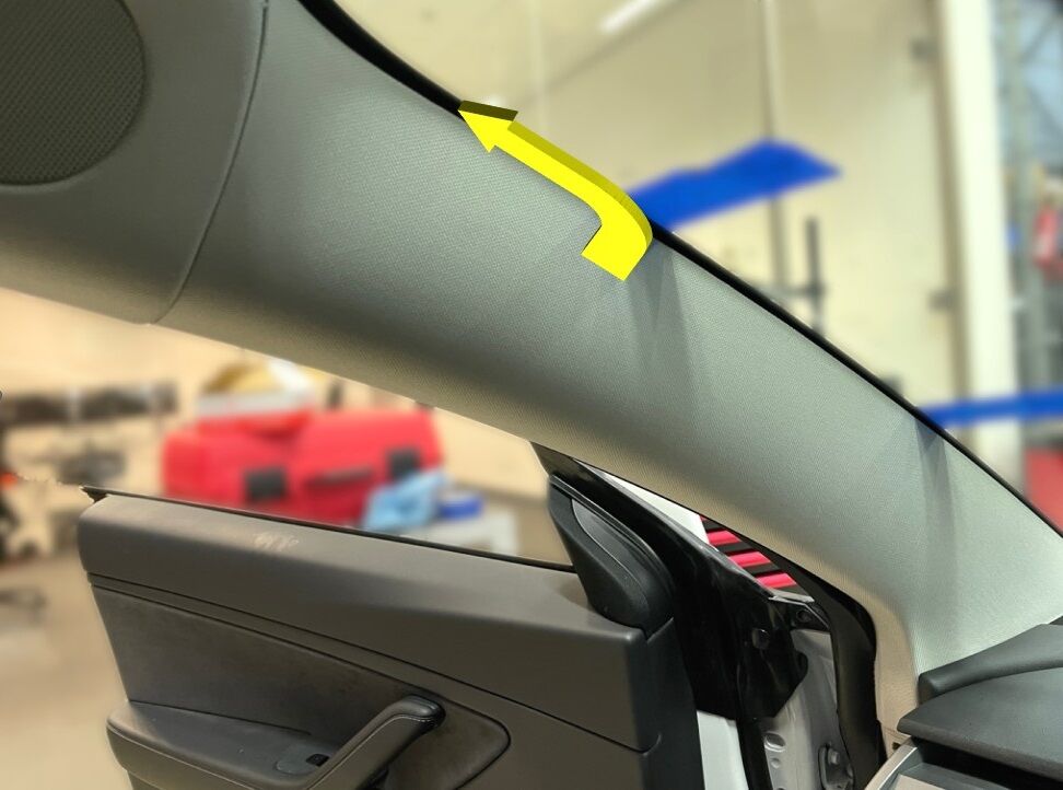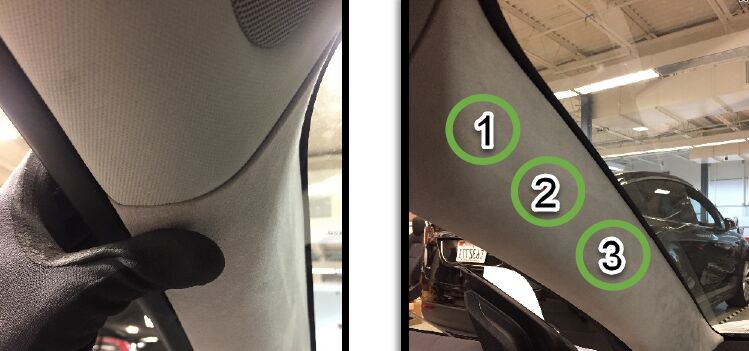 注1 个卡子,1 个锁片;对齐底部锁片,然后推动顶部卡子,使其完全就位于 A 柱中部;将密封件拉过饰板