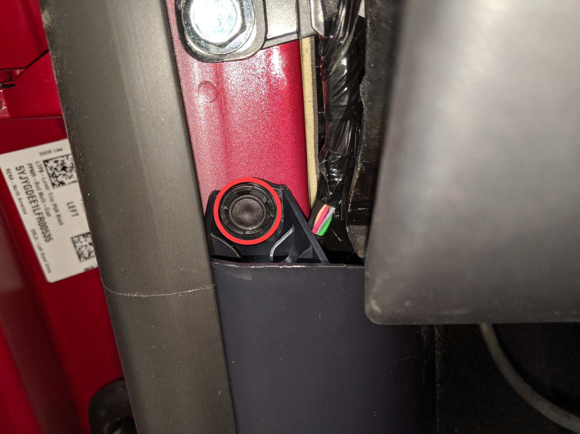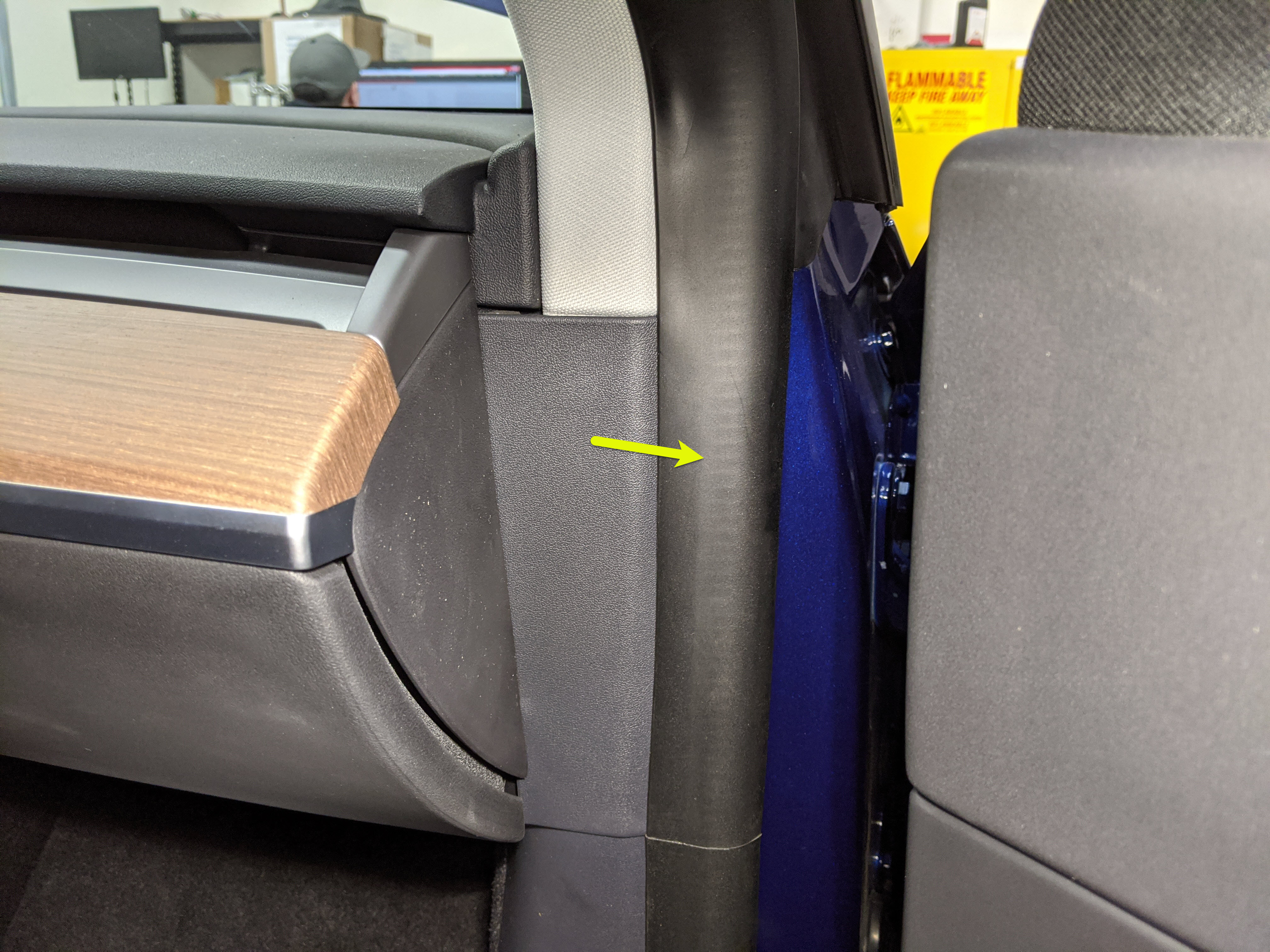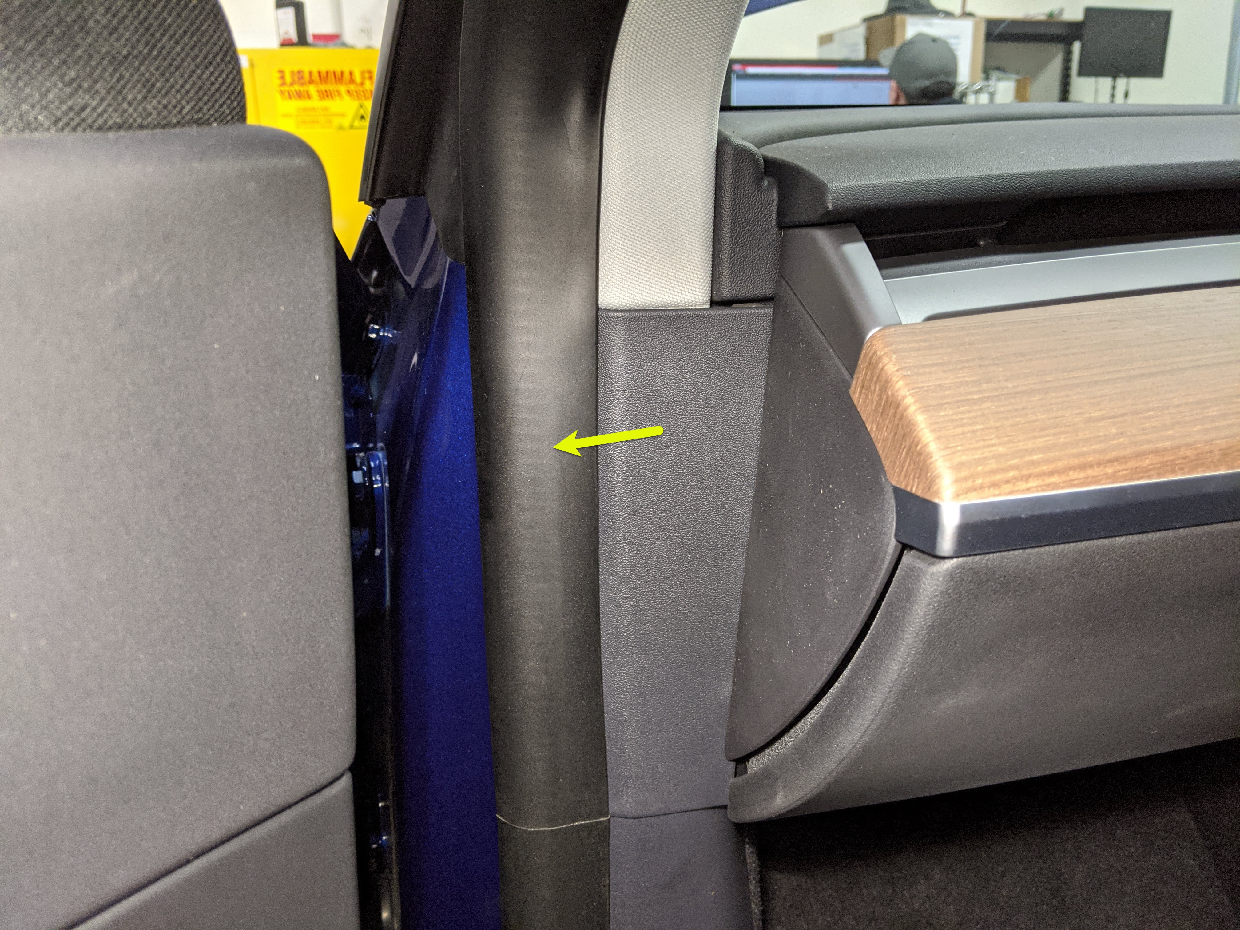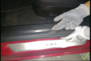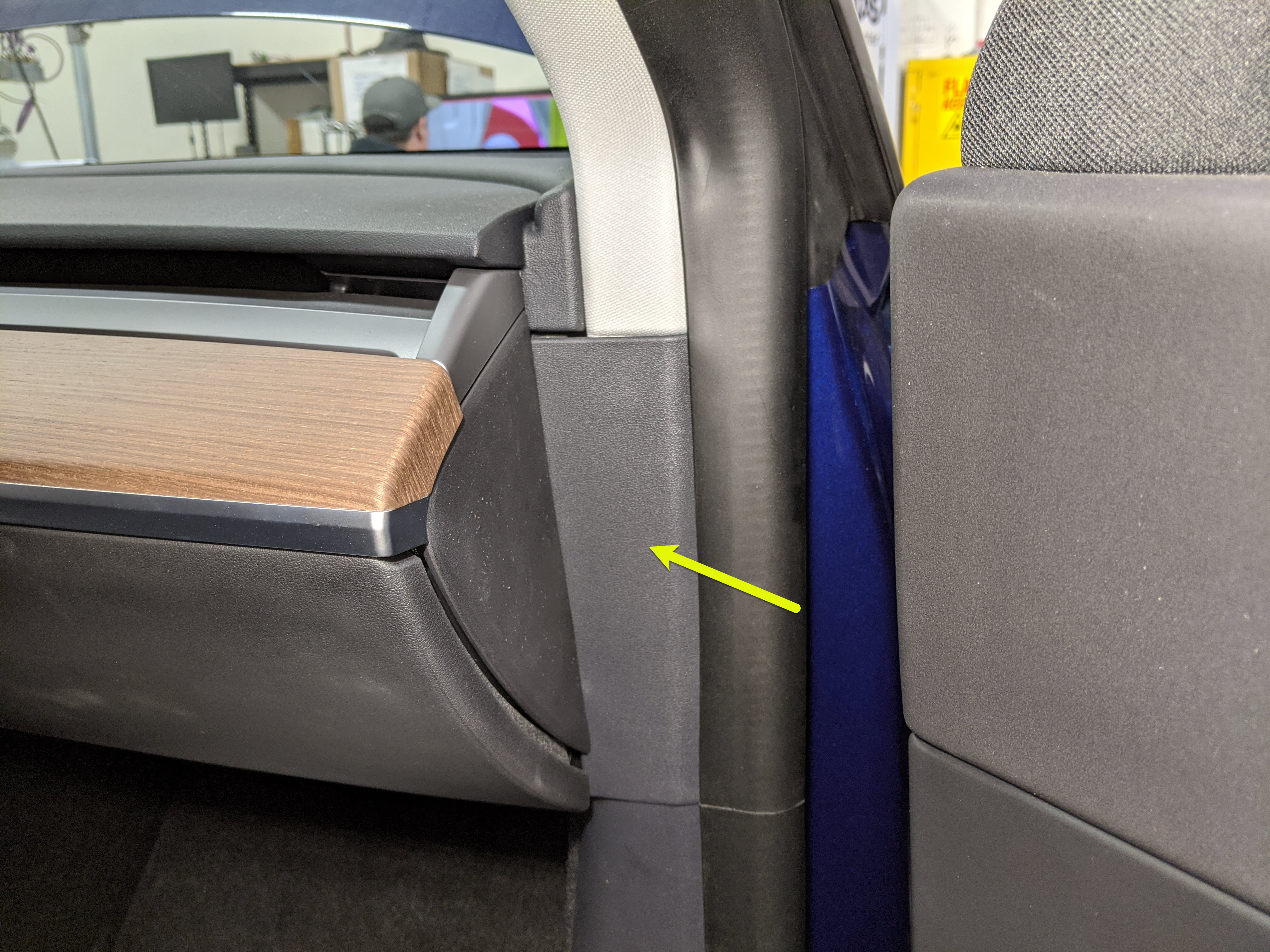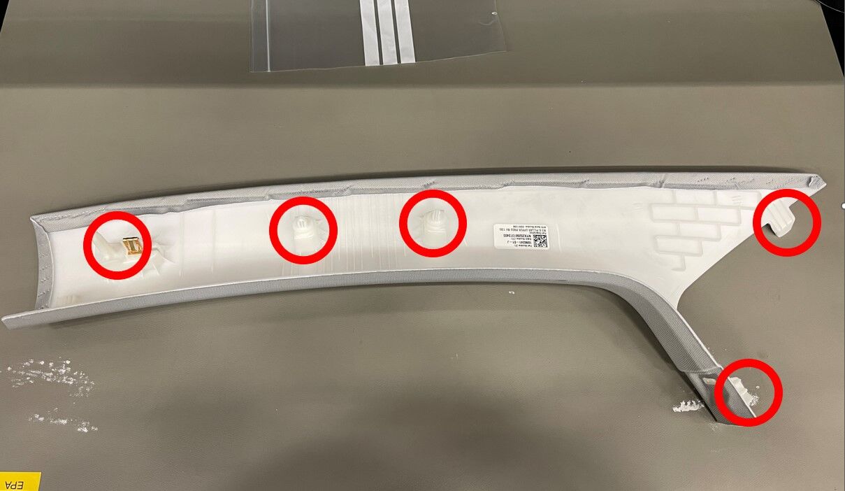 注1 个卡子,1 个锁片;对齐底部锁片,然后推动顶部卡子,使其完全就位于 A 柱中部;将密封件拉过饰板