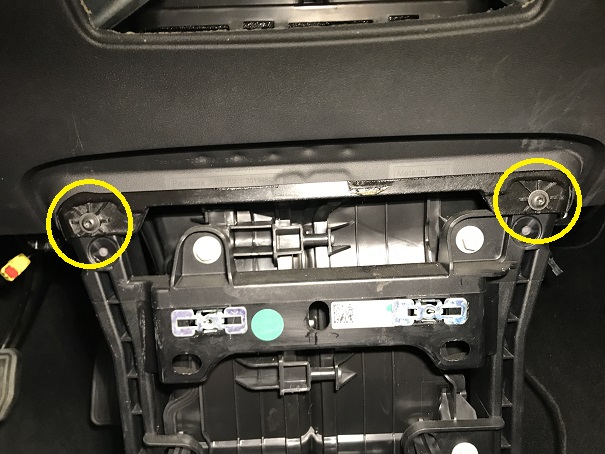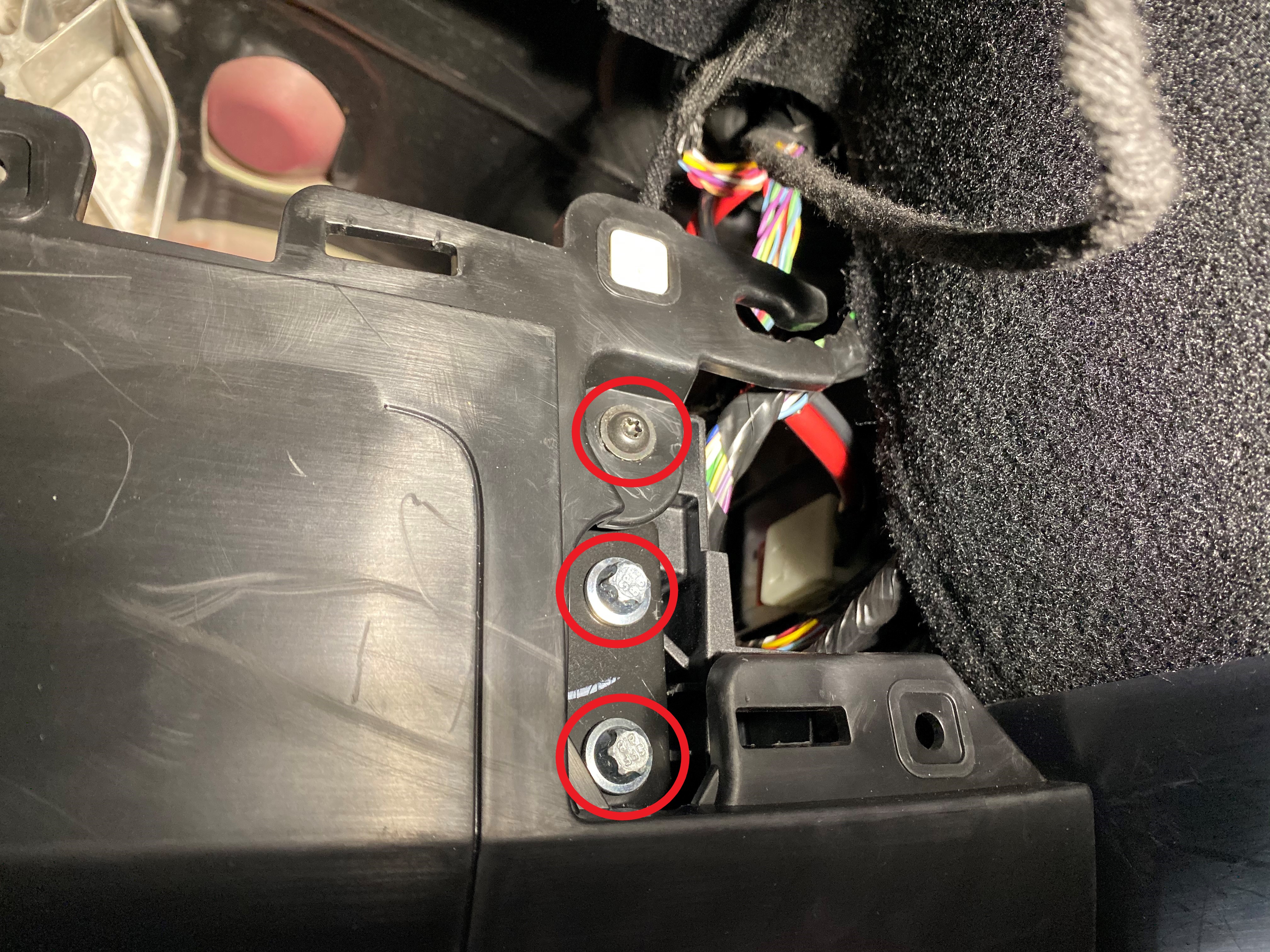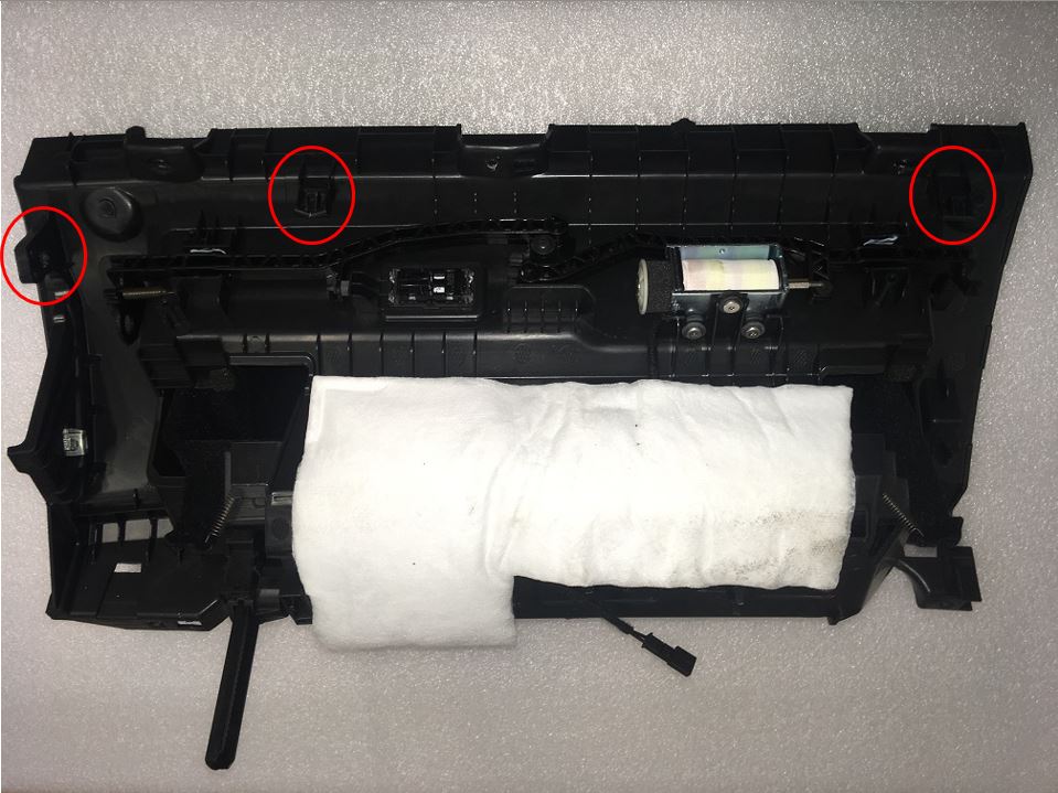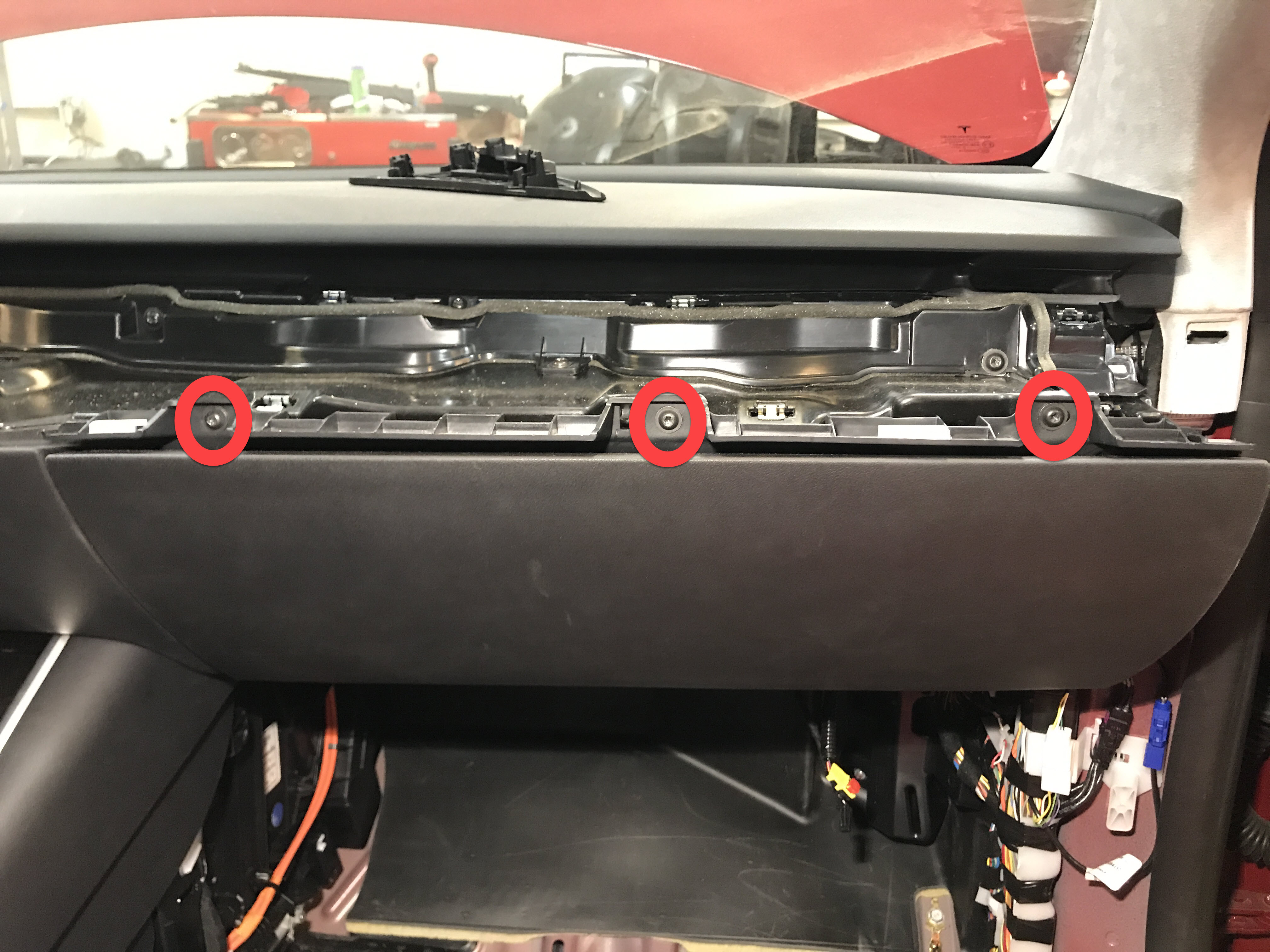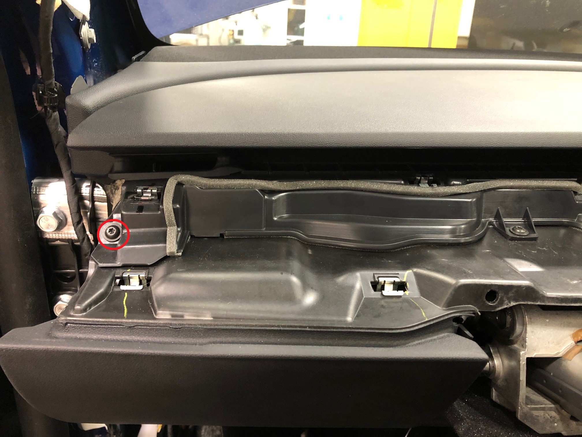 注不需要取下整块饰板。抬起饰板的 右侧就会有足够的空间拆下固定手套箱顶部的 3 个梅花螺钉;必要时更换固定夹