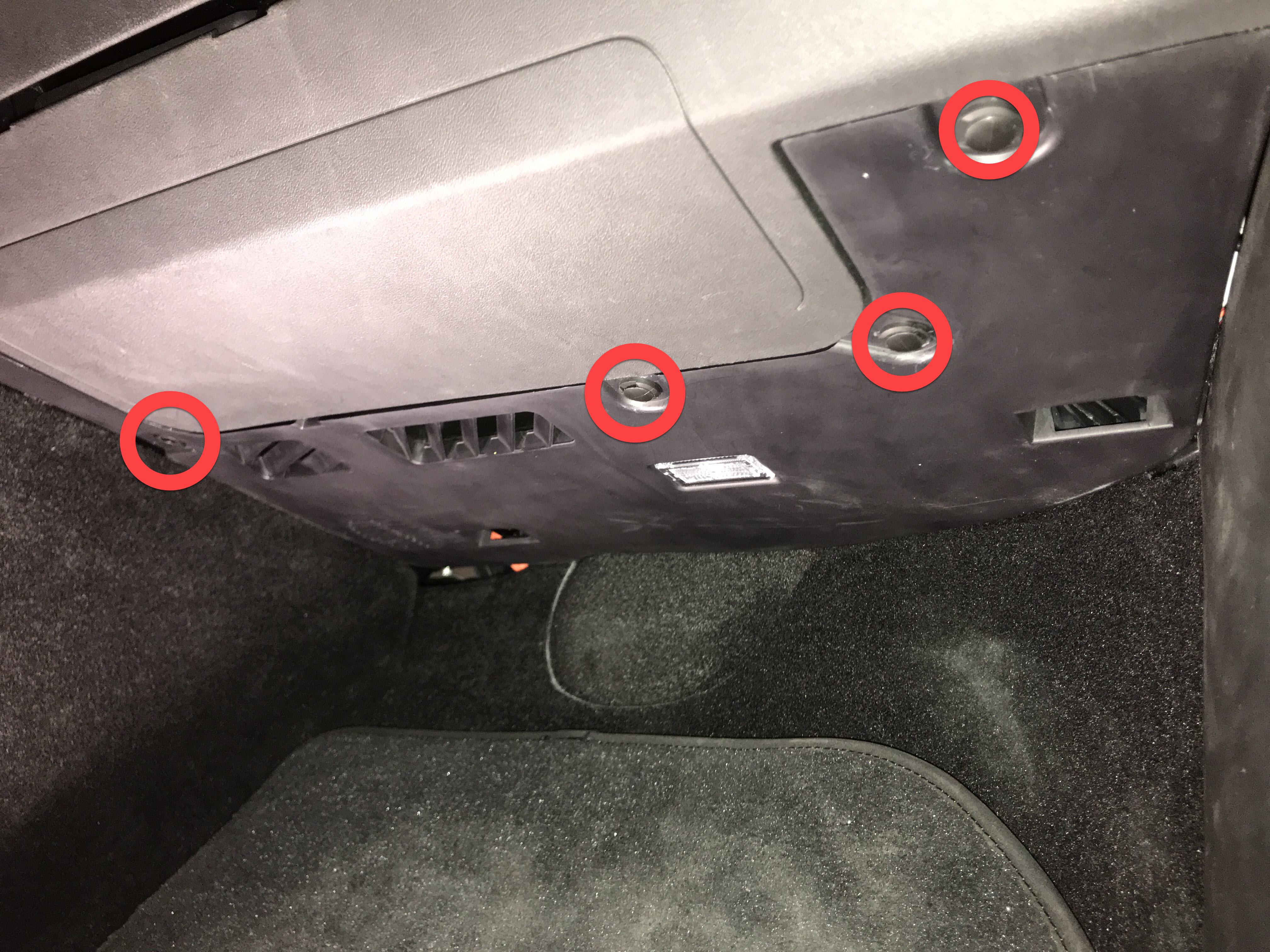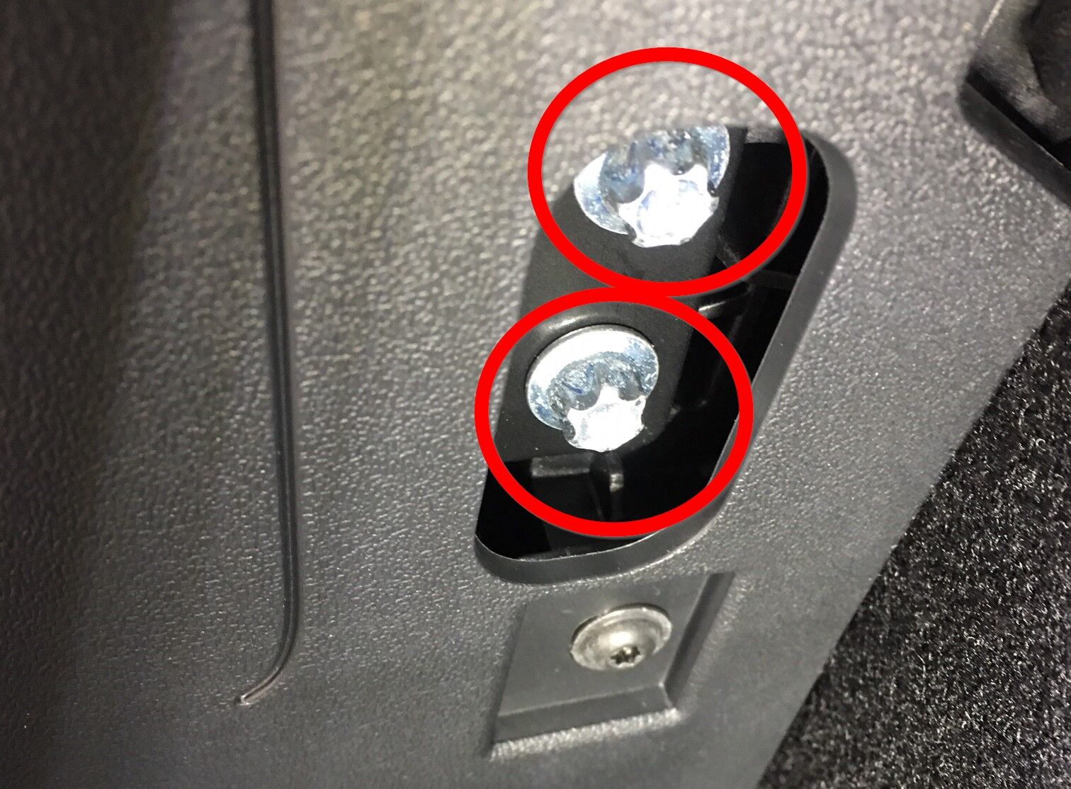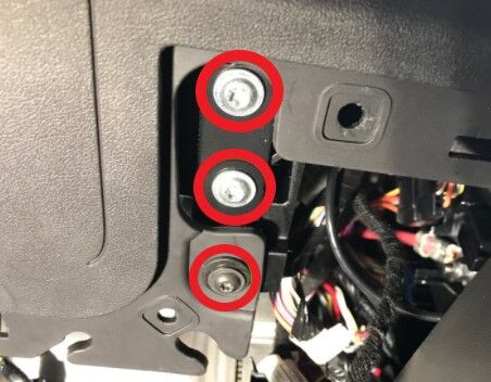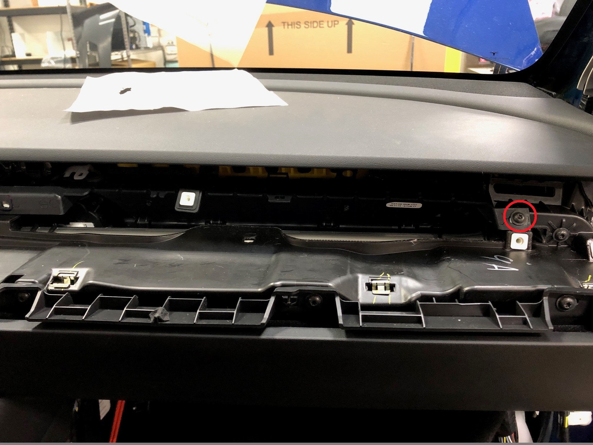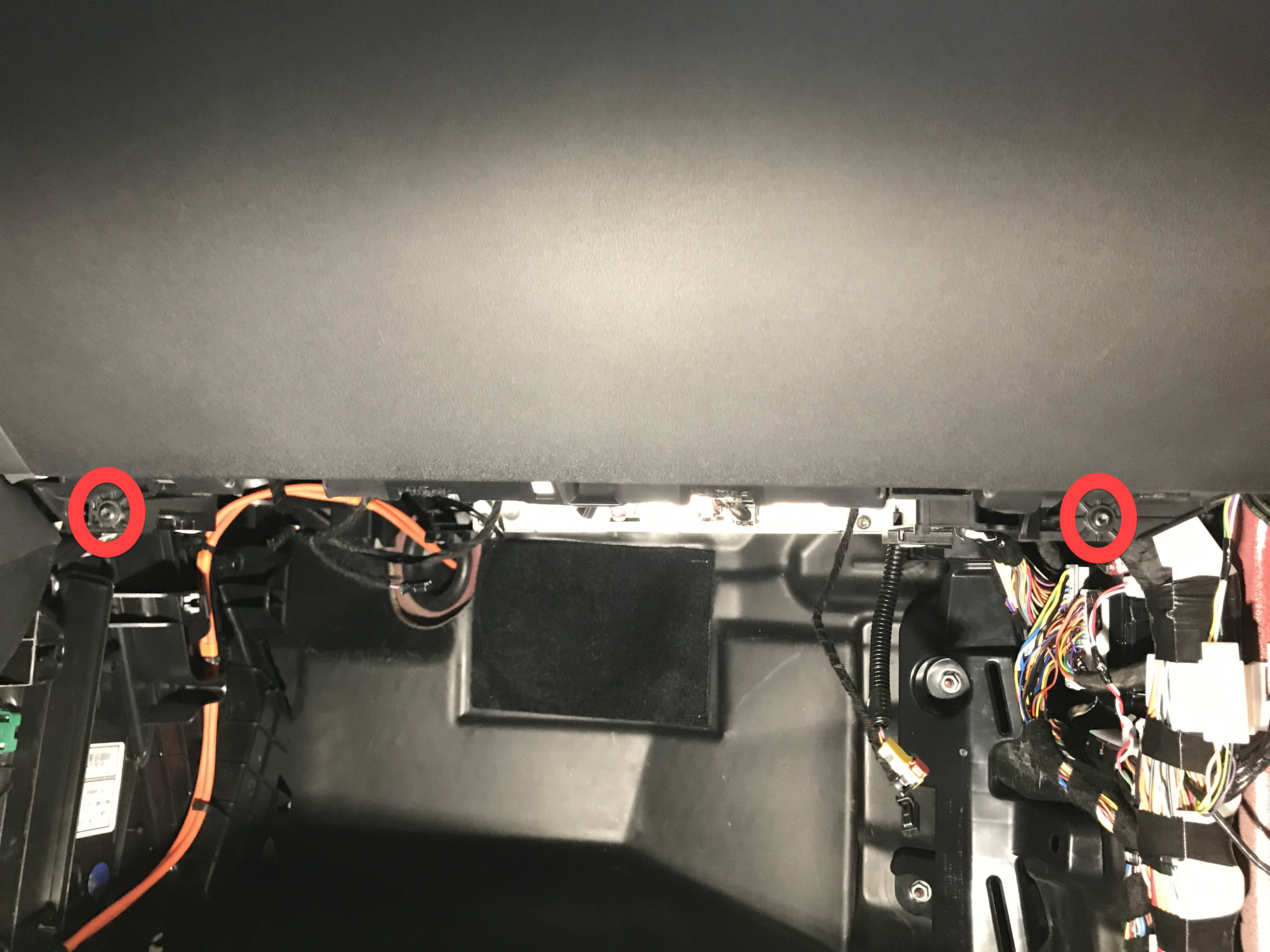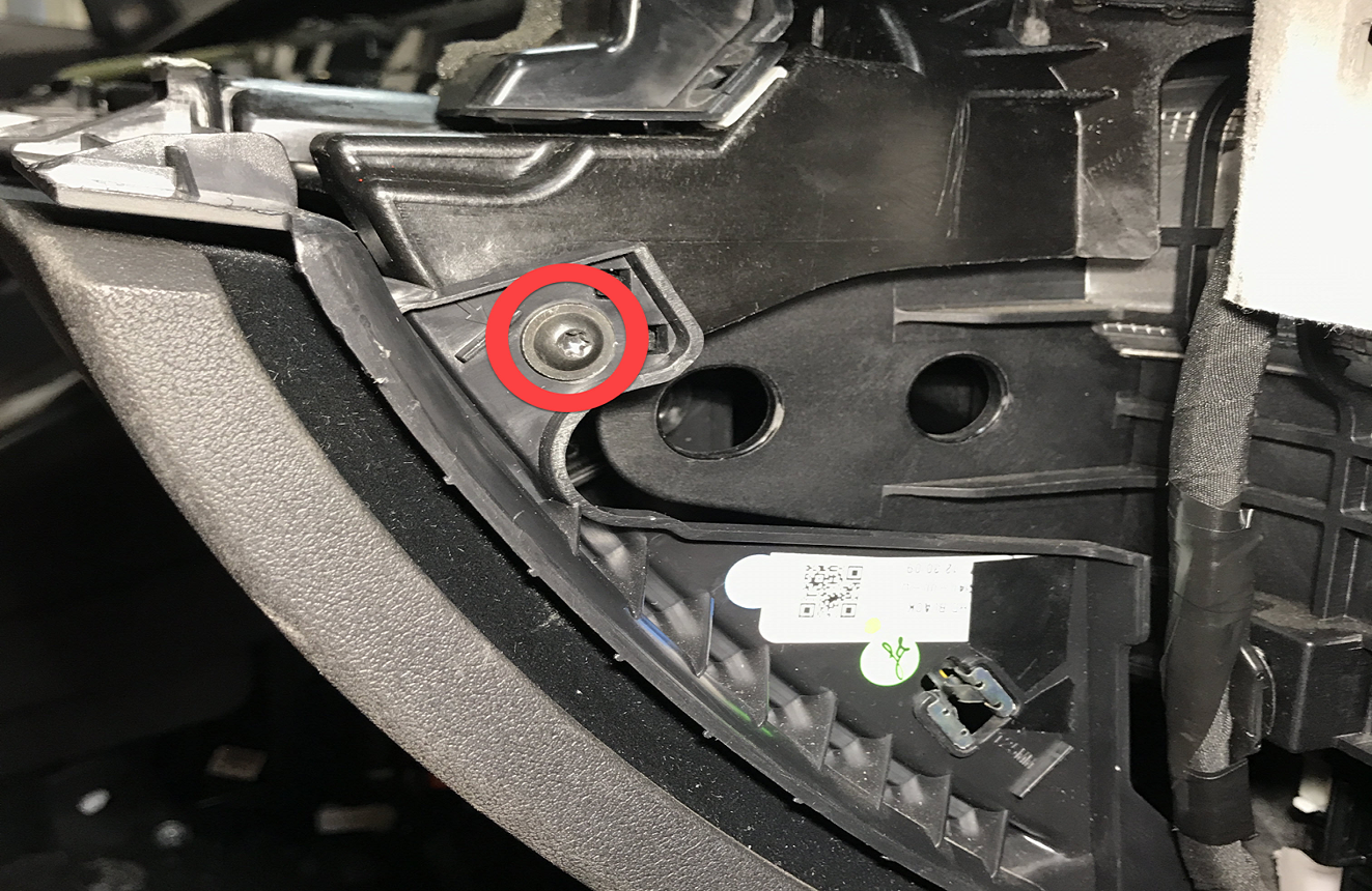 注不需要取下整块饰板。抬起饰板的 右侧就会有足够的空间拆下固定手套箱顶部的 3 个梅花螺钉;必要时更换固定夹