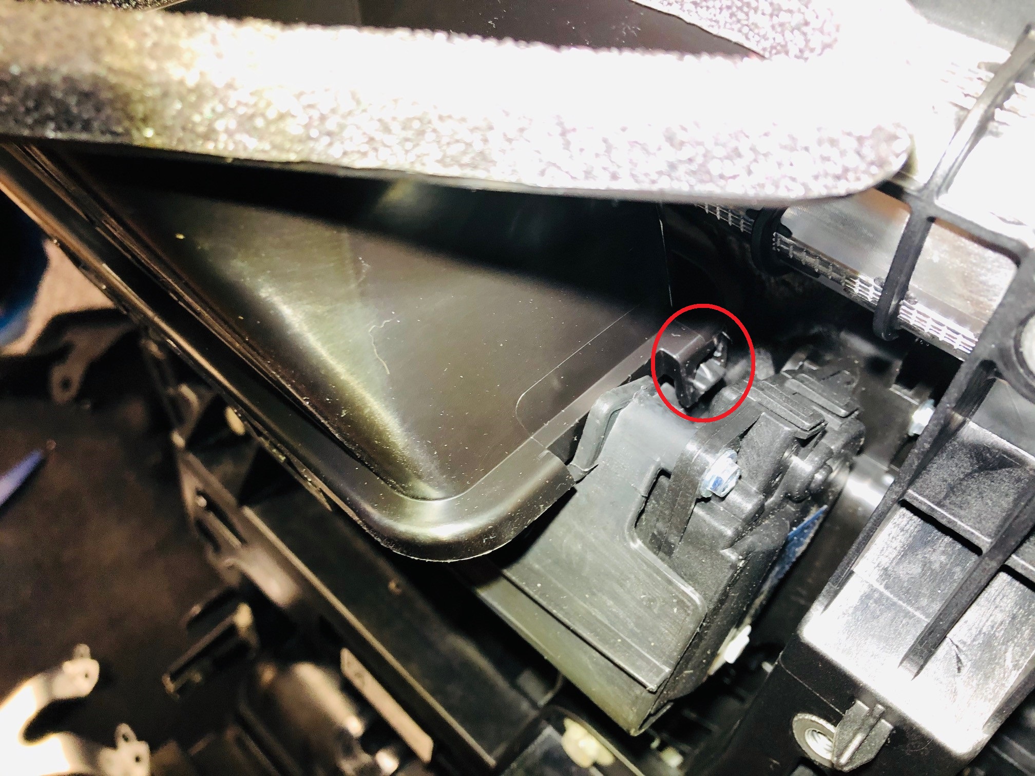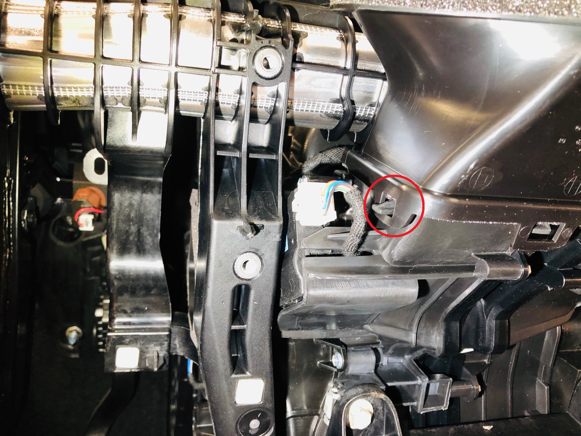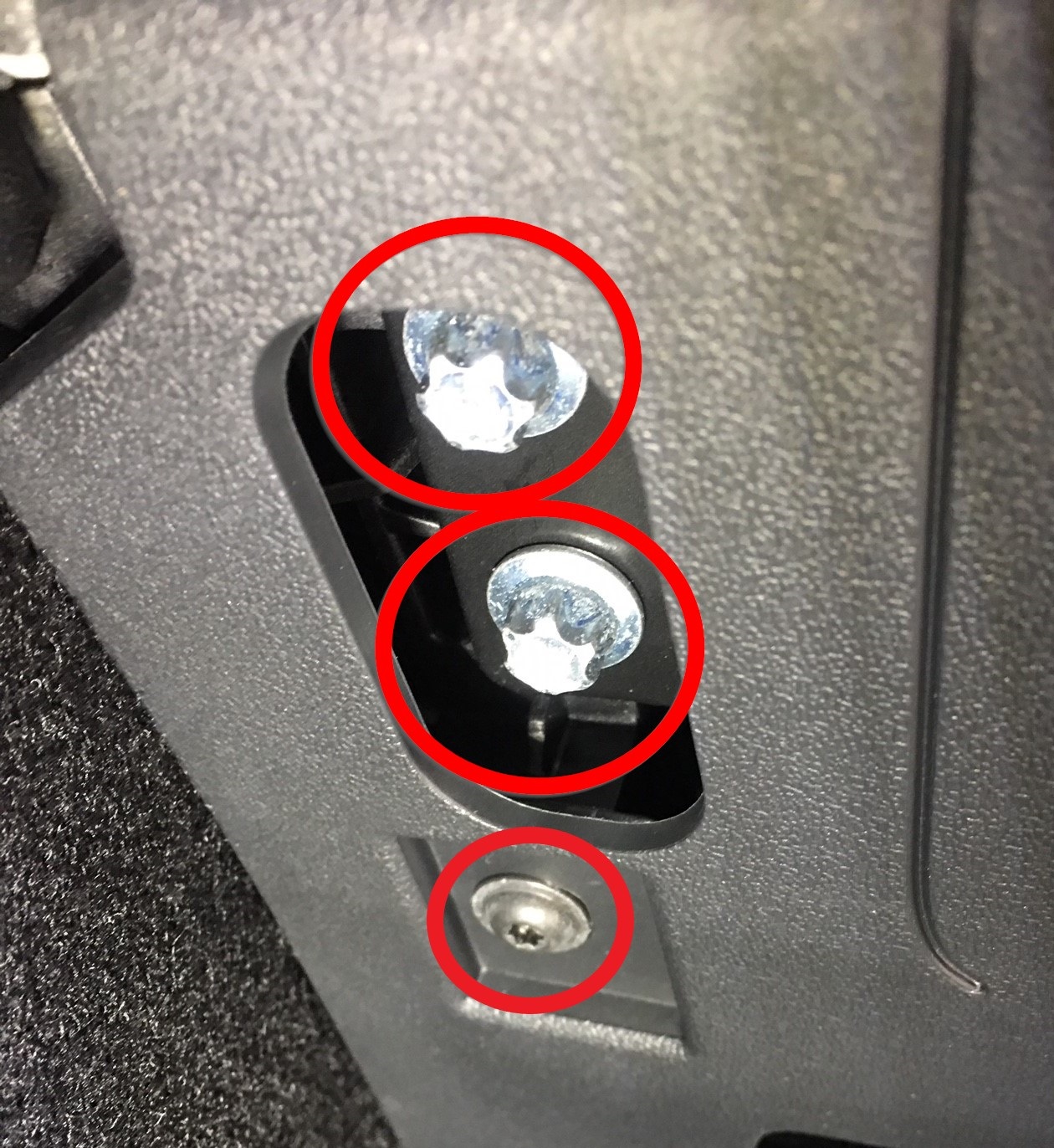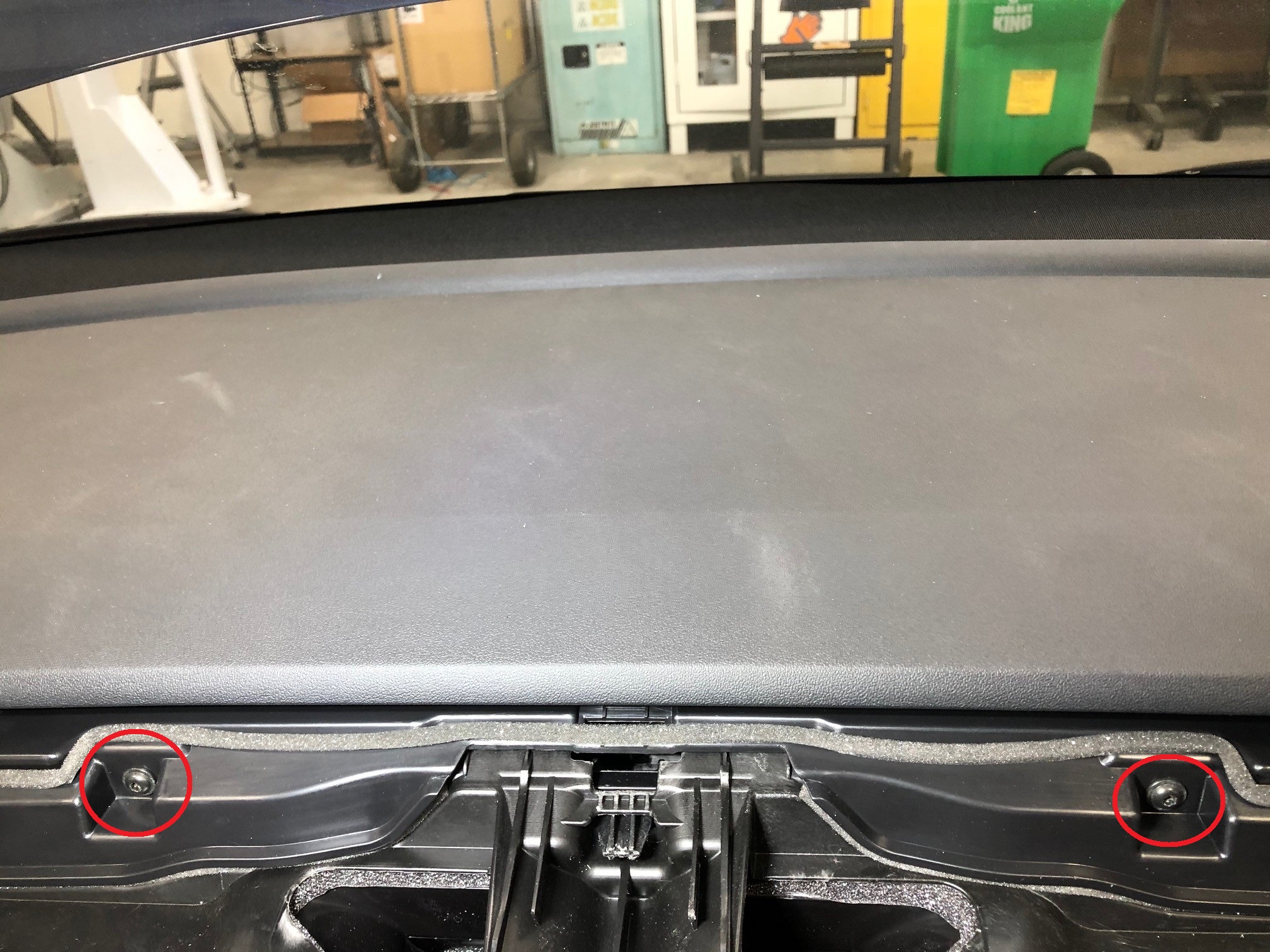 注不需要取下整块饰板。抬起饰板的 右侧就会有足够的空间拆下固定手套箱顶部的 3 个梅花螺钉;必要时更换固定夹
