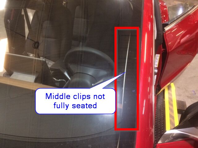 注1 个夹子,1 个锁片;对齐底部锁片,然后推动顶部夹子,完全就位中部 A 柱;确保密封件位于饰板顶部