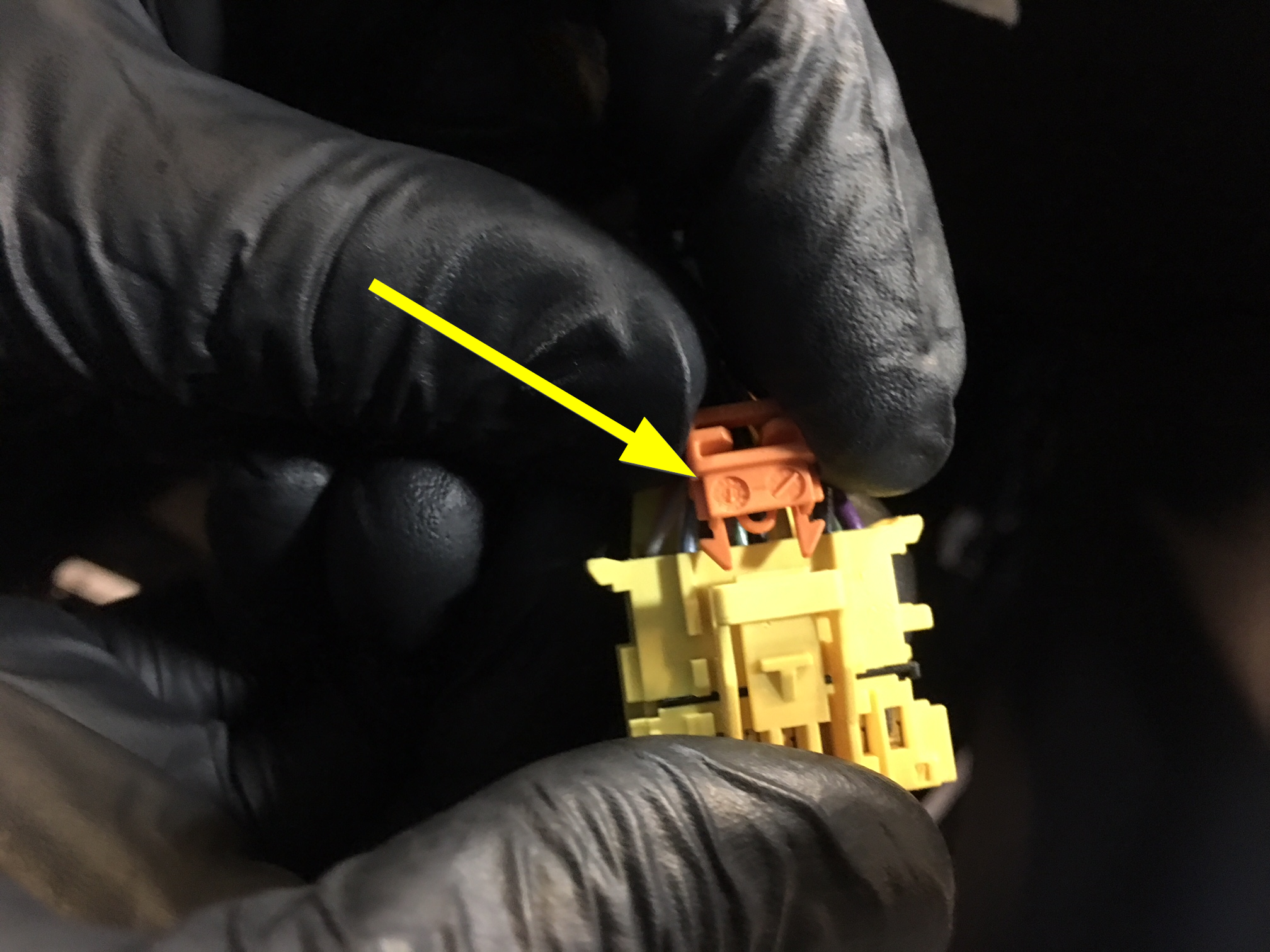 注1 个连接器;将新的橙色固定卡子安装到连接器上,然后安装转向柱控制模块 (SCCM) 连接器;执行推拉推测试,确保连接器稳妥固定
