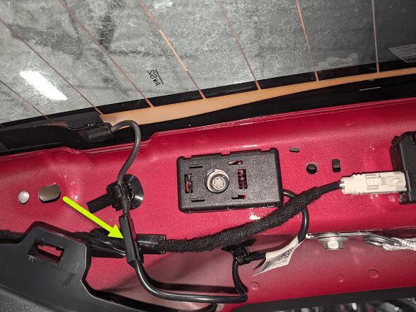 - 将电线固定在穿线器上,然后将穿线器推进 RH C 柱底部的聚氨酯内。