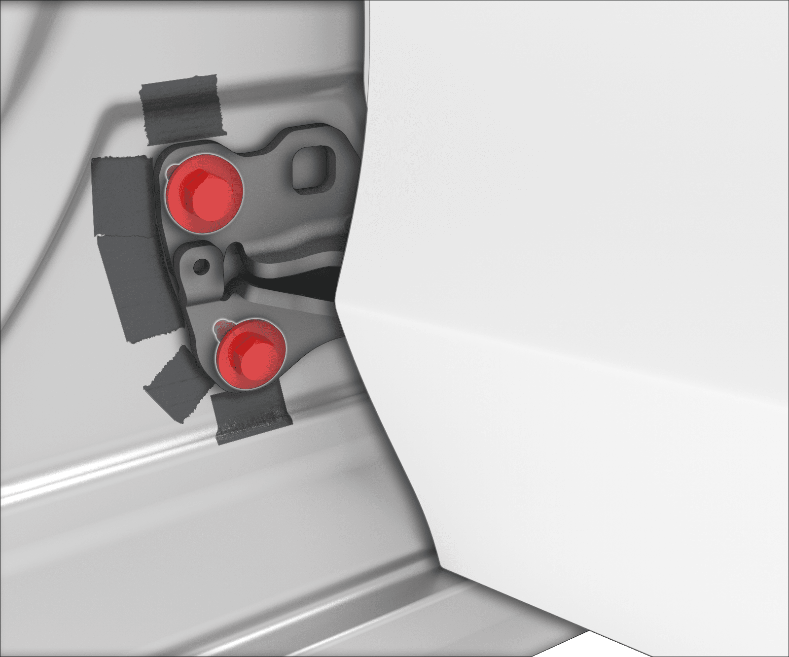 - Align the new lower hinge with the applied tape on the body, and then install the nuts that attach the lower door hinge to body hand tight.