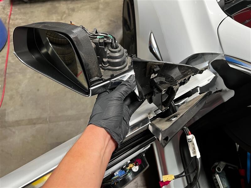 使用塑料饰板工具沿着内边缘撬起左侧后视镜盖。
