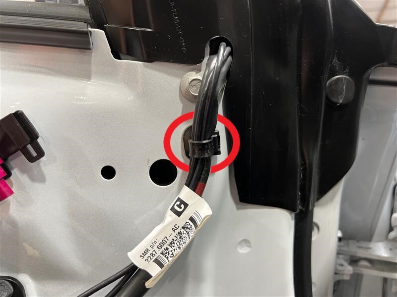 松开将左前后视镜固定到车门总成的卡子,将索环推过车门开口,然后将后视镜线束穿过车门,同时提起后视镜以将其从车门总成上拆下。