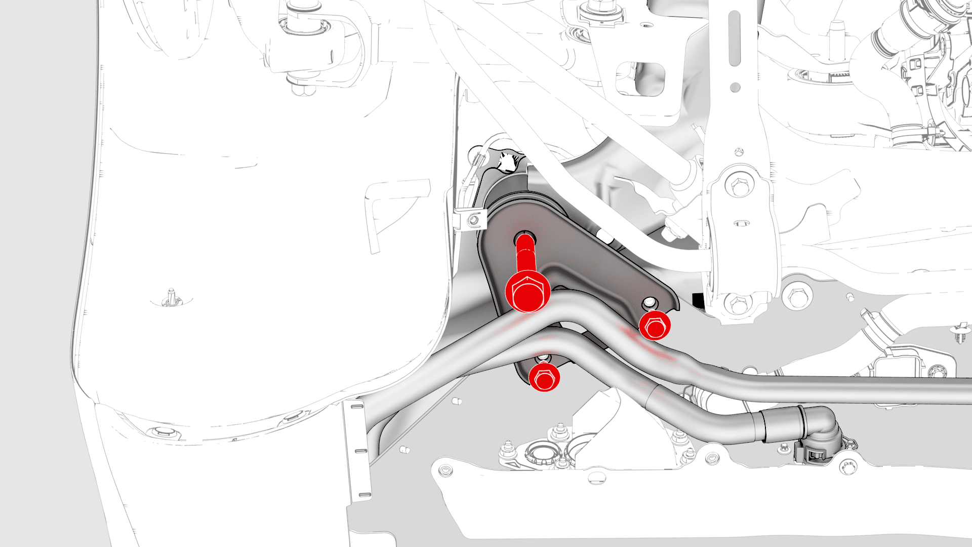 将长螺栓(2 个)从后副车架前部拆下,将左右剪力板安装到副车架和高压电池上,然后安装将剪力板固定到副车架和高压电池的螺栓(3 个)。