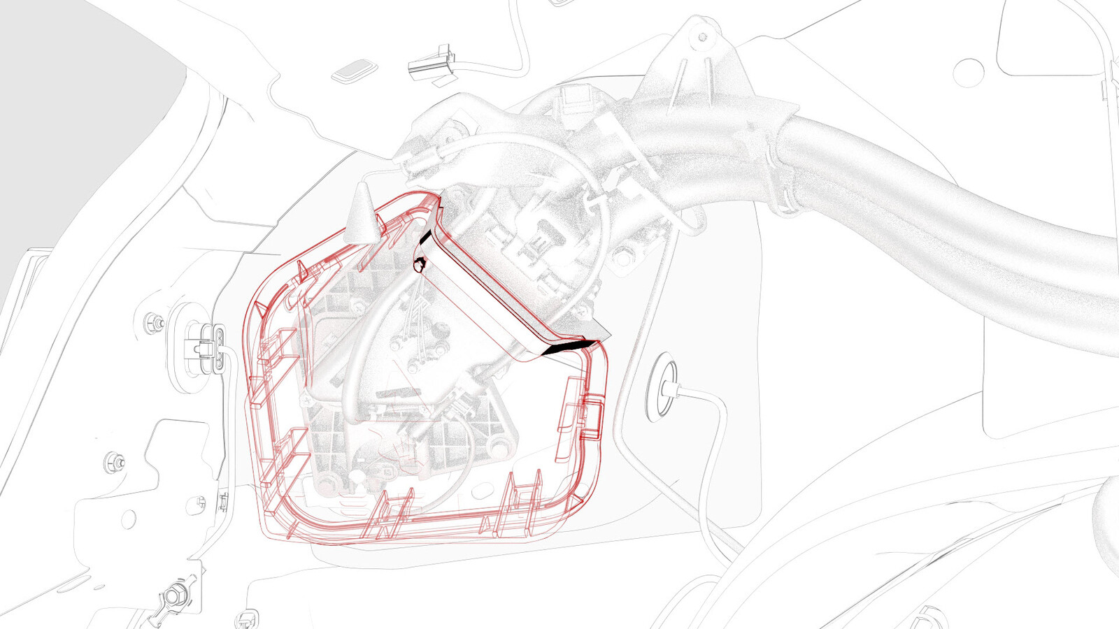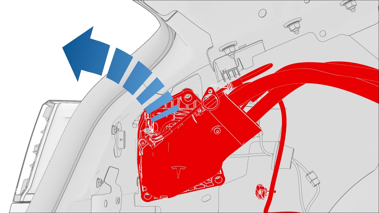 将充电接口盖板总成安装到车辆上:转动总成,使得传动装置在围板下方无阻碍,然后朝着后车门方向滑动总成。