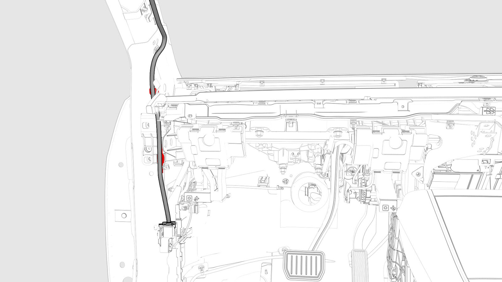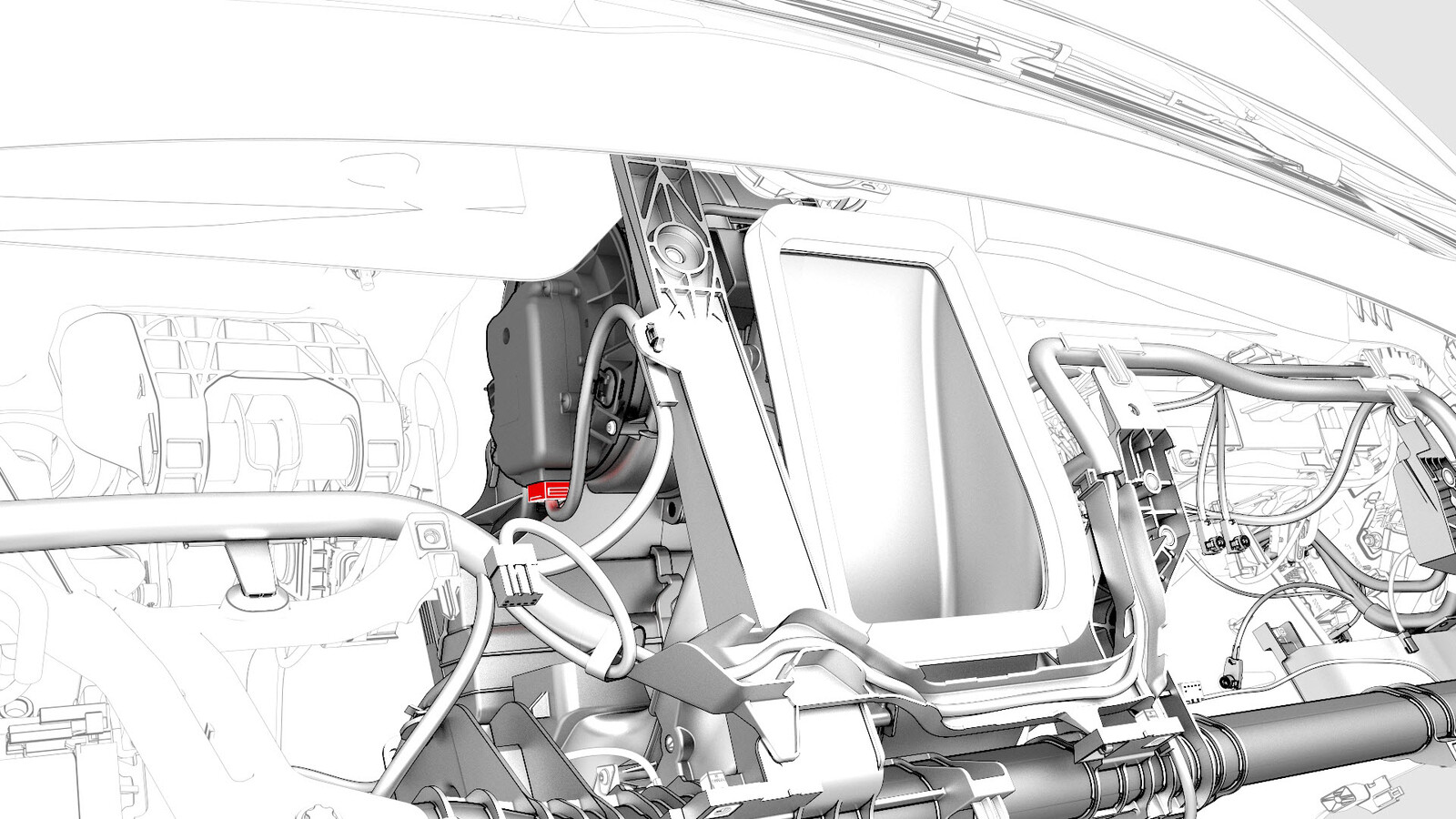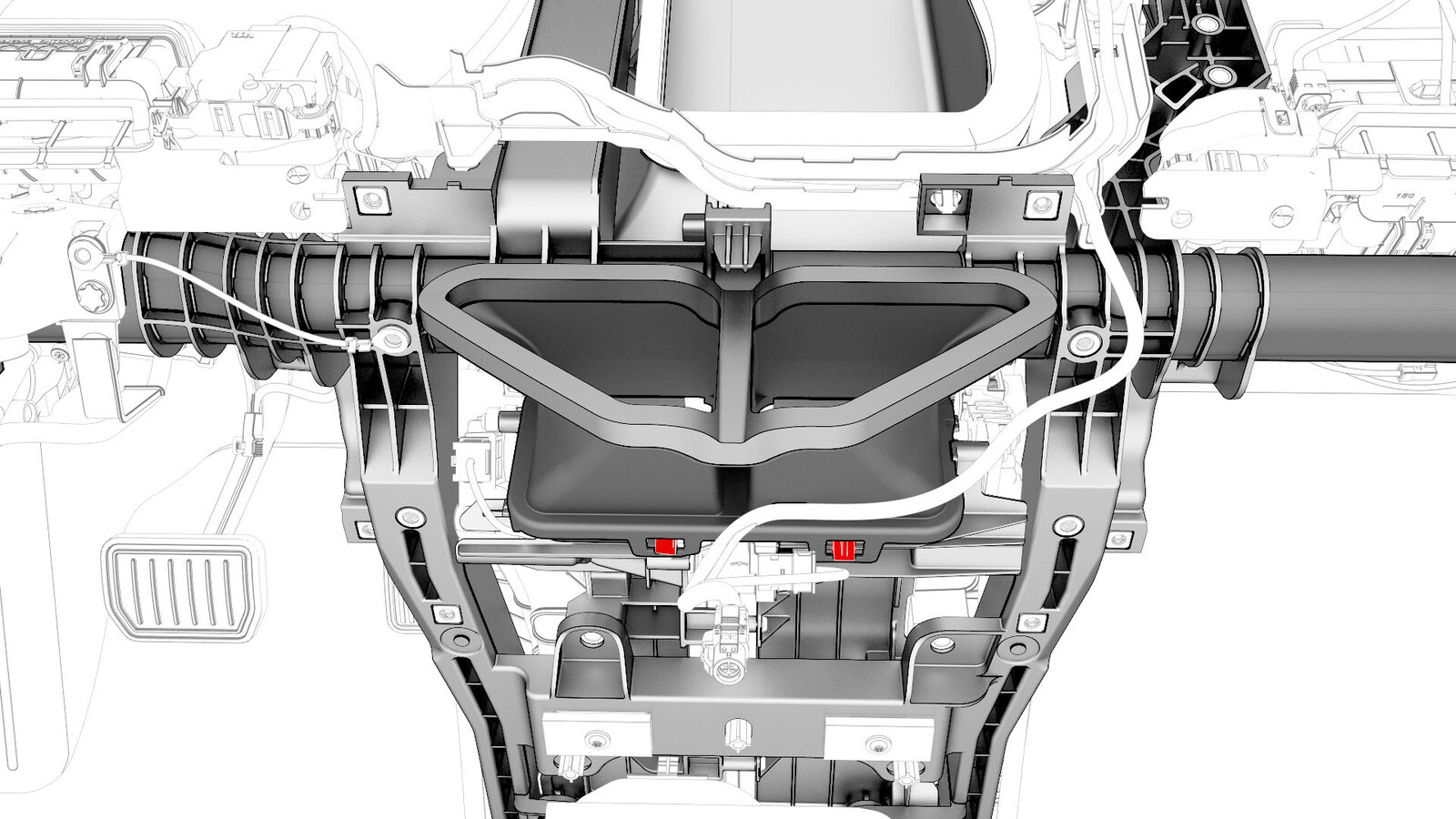 - 拆卸左侧脚部空间进气槽。请参阅#GUID-4B963839-927B-422B-B1BC-81666CE43923。