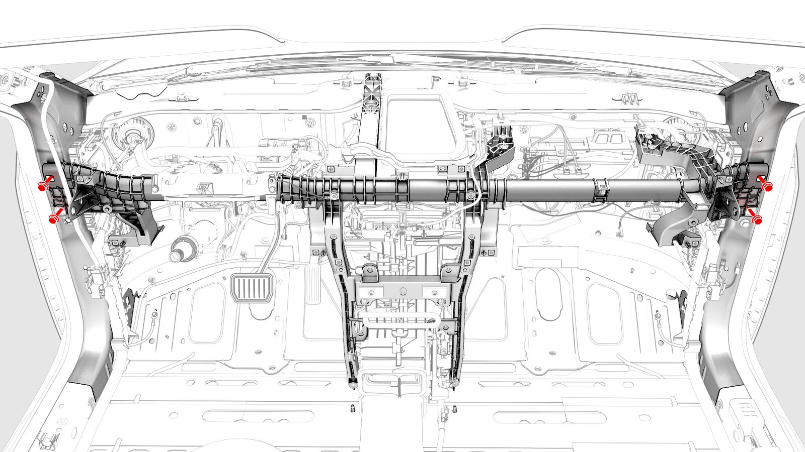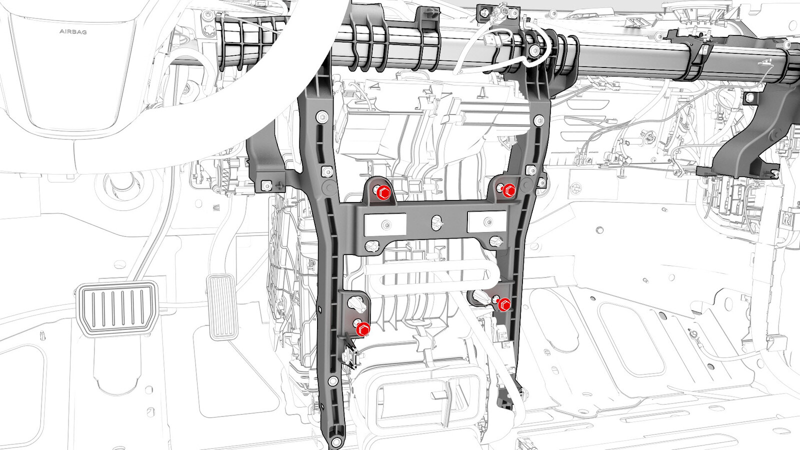 拆卸将横梁固定到 HVAC 总成的螺栓(4 个)。