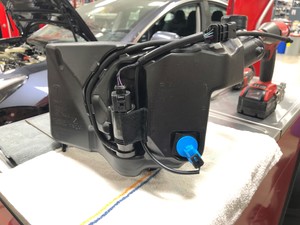 将挡风玻璃清洗器储液罐安装到正确位置,然后将电气线束连接到挡风玻璃清洗器储液罐连接器。