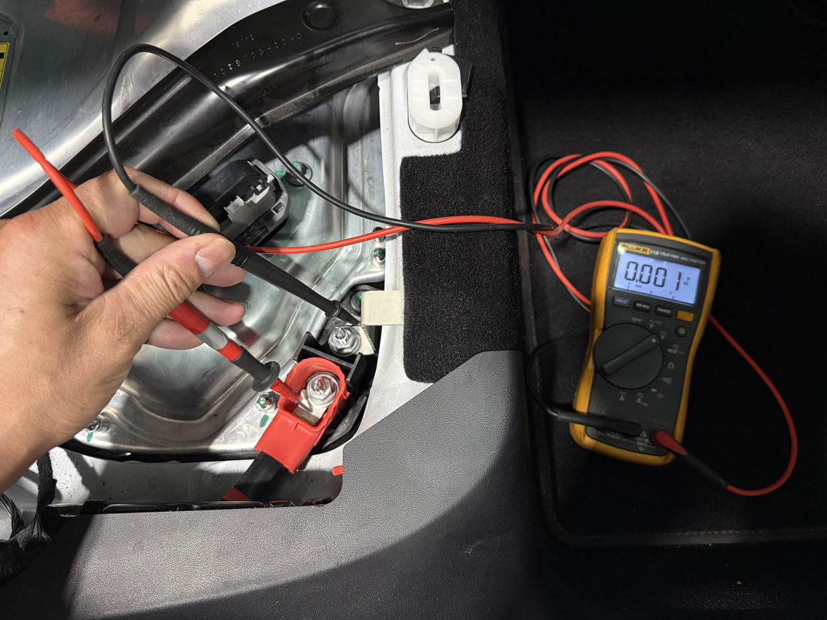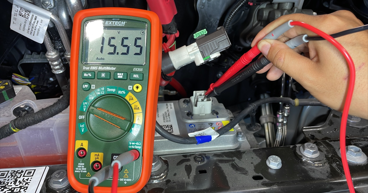 设置万用表以测量电压,然后测量 12V 电池/低压辅助电池端子间的电压。