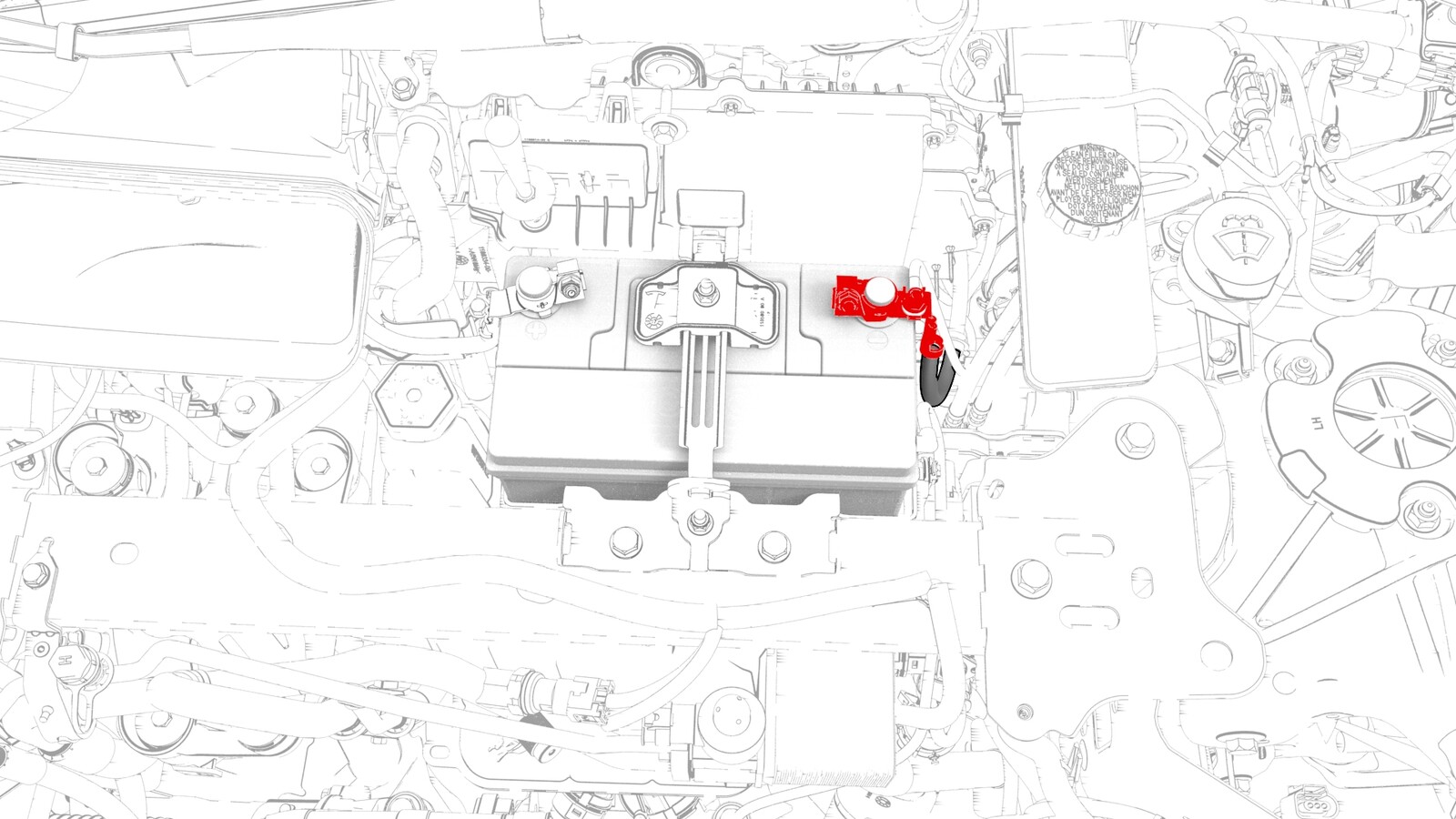 - 将 12V 电池负极电缆连接到电池,然后向下按压端子卡夹,使其牢固就位于电池极柱上。