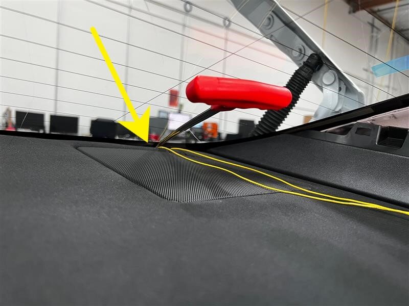 CAUTIONMove the cutting tool as needed to keep the line close to a 90° angle. Use a plastic guard to protect the headliner and package tray assembly during removal.