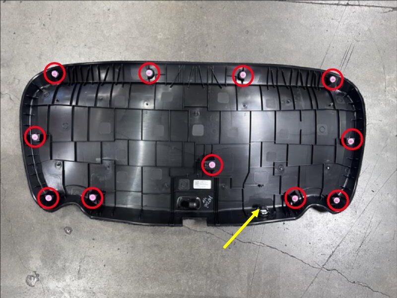 Note11x clips, 1x connector, Release RH upper corner clip then work your way around trim, Remove any broken clips from trunk assembly, Support trim while disconnecting to avoid damage