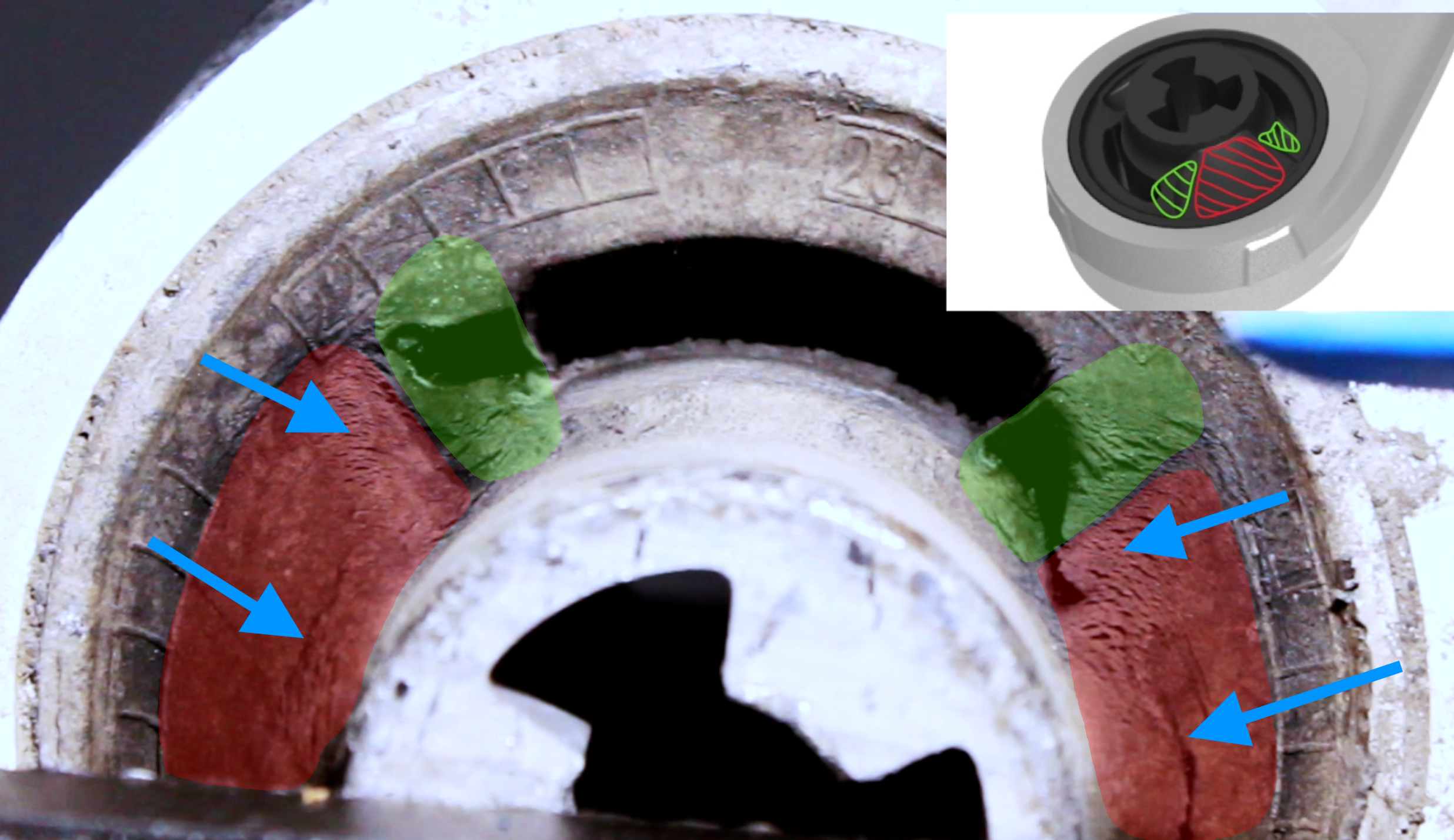 A bushing that demonstrates a 20% or greater decay in stiffness when compared to a new part should be replaced. On some bushings, the location of the damage can be used to determine whether the part should be replaced. Refer to the images below: TIp More detail on front lateral and compliance link bushing inspections is available in this video. |