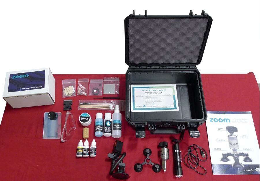 Inspect the glass crack repair kit, ensure all tools are present and resin residue is not present, and then inspect the seals for cracks, wear or swelling.