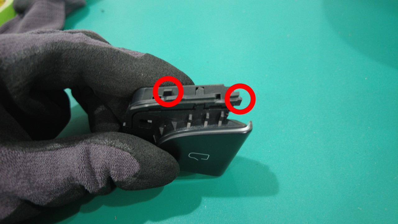 NoteCarefully insert a V-shape wedge into the gap between the switch and the handle to release the clips.CAUTIONTake sure not to damage the handle and door trim.