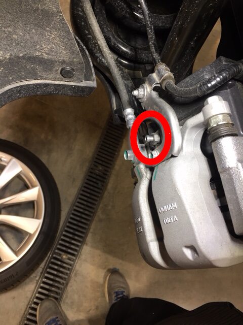 Note2x bleeding valves, 11mm, 18.5 Nm (+/- 2 Nm) Base and Plus calipers, Begin with the outer valve first then move on to the inner valve then conclude with he outer valve again, Repeat step till clear fluid and no air bubbles come out of RH front brake caliper bleeding outer and inner valves
