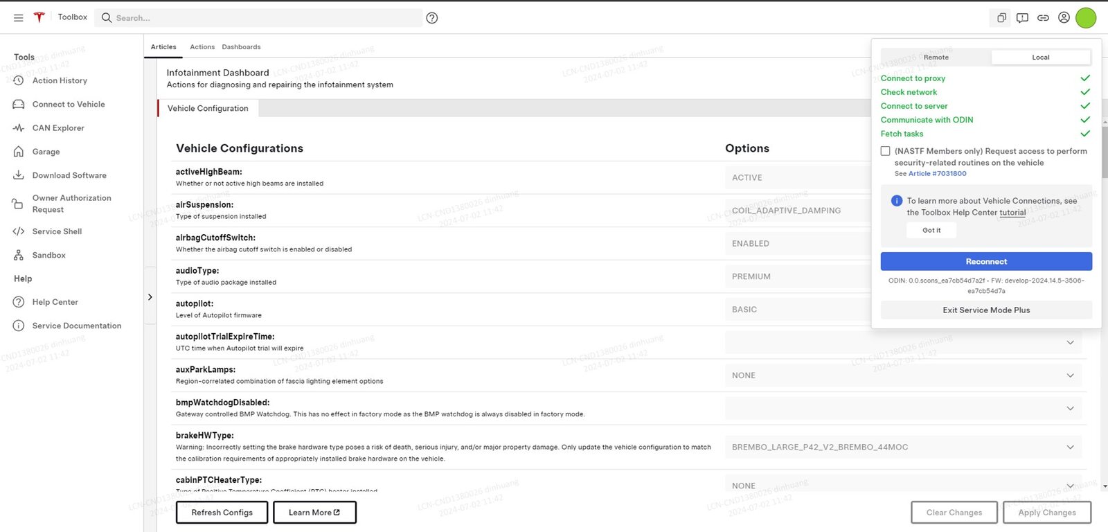 NoteVehicle OBD-II connection is integrated into drivers footwell cover, Navigate to https://toolbox.teslamotors.com and establish connection to vehicle, Select connection status icon at top right corner then select connect locally, Icon will turn green when connected, Successful connection will automatically unlock vehicle gateway and place UI in Service Mode Plus, For local connection issues with Toolbox refer to https://toolbox.teslamotors.com/articles/43695